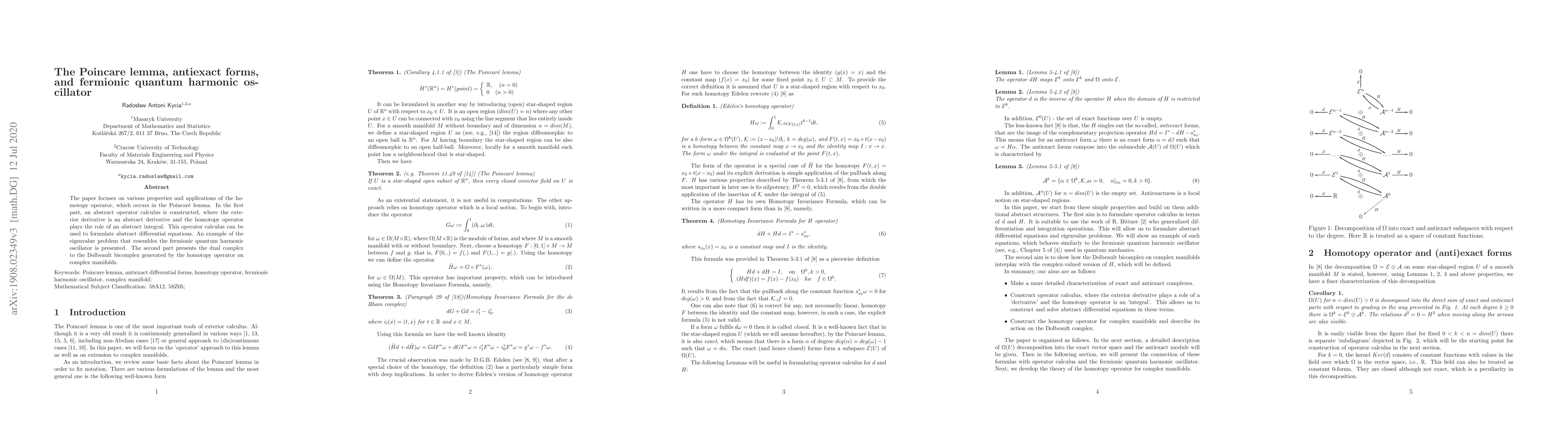 Summary: This paper explores the homotopy operator in the context of the Poincaré lemma, developing an abstract operator calculus where the exterior derivative acts as an abstract derivative and the homotopy operator as an abstract integral. It also connects this framework to a fermionic quantum harmonic oscillator eigenvalue problem and introduces the dual complex related to the Dolbeault bicomplex on complex manifolds.