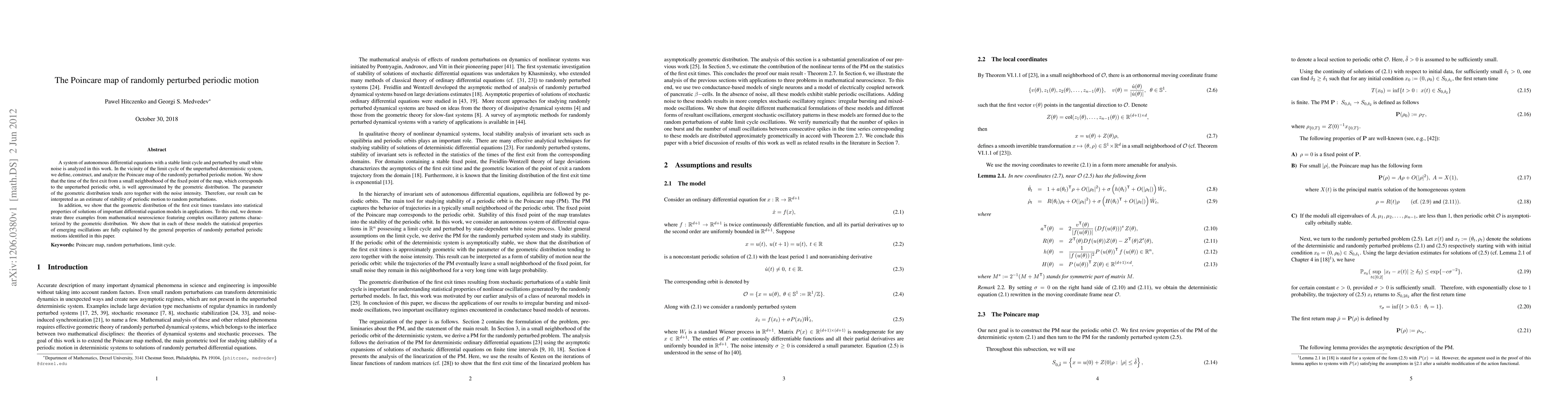A system of autonomous differential equations with a stable limit cycle and perturbed by small white noise is analyzed in this work. In the vicinity of the limit cycle of the unperturbed deterministic system, we define, construct, and analyze the Poincare map of the randomly perturbed periodic motion. We show that the time of the first exit from a small neighborhood of the fixed point of the map, which corresponds to the unperturbed periodic orbit, is well approximated by the geometric distribution. The parameter of the geometric distribution tends zero together with the noise intensity. Therefore, our result can be interpreted as an estimate of stability of periodic motion to random perturbations. In addition, we show that the geometric distribution of the first exit times translates into statistical properties of solutions of important differential equation models in applications. To this end, we demonstrate three examples from mathematical neuroscience featuring complex oscillatory patterns characterized by the geometric distribution. We show that in each of these models the statistical properties of emerging oscillations are fully explained by the general properties of randomly perturbed periodic motions identified in this paper.