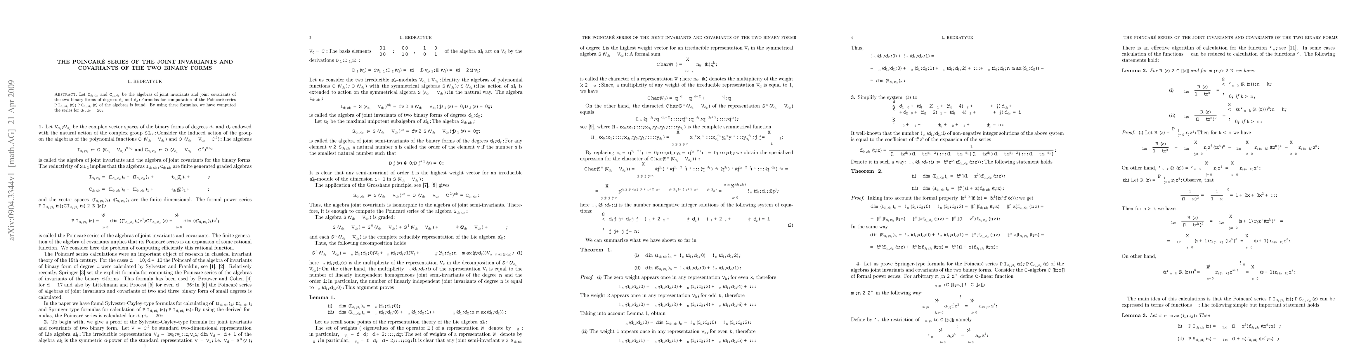 Let $\mathcal{I}_{d_1,d_2}$ and $\mathcal{C}_{d_1,d_2}$ be the algebras of joint invariants and joint covariants of the two binary forms of degrees $d_1$ and $d_2.$ Formulas for computation of the Poincar\'e series $\mathcal{PI}_{d_1,d_2}(z),$ $ \mathcal{PC}_{d_1,d_2}(z)$ of the algebras is found. By using these formulas, we have computed the series for $d_1,d_2 \leq 20.$