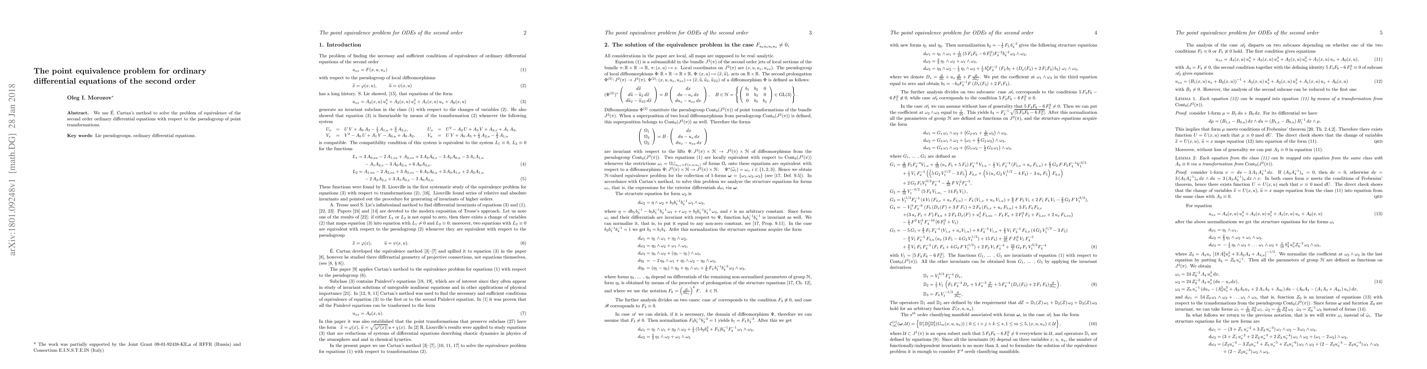 Summary: This paper employs E. Cartan's method to determine the equivalence of second-order ordinary differential equations under the pseudogroup of point transformations, providing a solution to the point equivalence problem.
