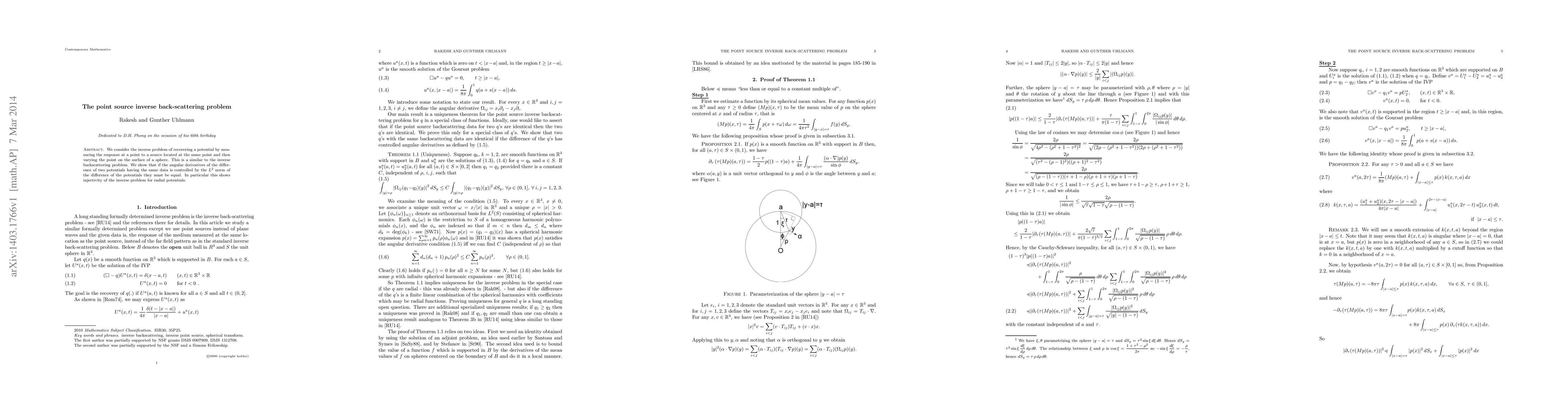 We consider the inverse problem of recovering a potential by measuring the response at a point to a source located at the same point and then varying the point on the surface of a sphere. This is a similar to the inverse back-scattering problem. We show that if the angular derivatives of the difference of two potentials having the same data is controlled by the L^2 norm of the difference of the potentials they must be equal. In particular this shows injectivity of the inverse problem for radial potentials.