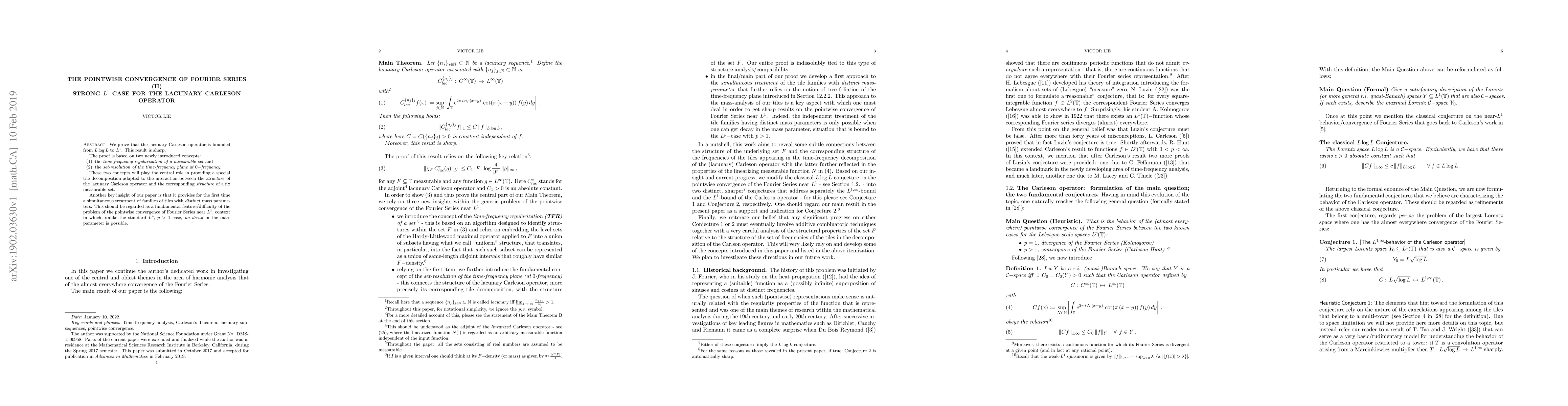 We prove that the lacunary Carleson operator is bounded from $L \log L$ to $L^{1}$. This result is sharp. The proof is based on two newly introduced concepts: 1) the \emph{time-frequency regularization of a measurable set} and 2) the \emph{set-resolution of the time-frequency plane at $0-$frequency}. These two concepts will play the central role in providing a special tile decomposition adapted to the interaction between the \emph{structure} of the lacunary Carleson operator and the corresponding \emph{structure} of a fix measurable set. Another key insight of our paper is that it provides for the first time a simultaneous treatment of families of tiles with \emph{distinct} mass parameters. This should be regarded as a fundamental feature/difficulty of the problem of the pointwise convergence of Fourier Series near $L^1$, context in which, unlike the standard $L^p,\:p>1$ case, \emph{no decay} in the mass parameter is possible.