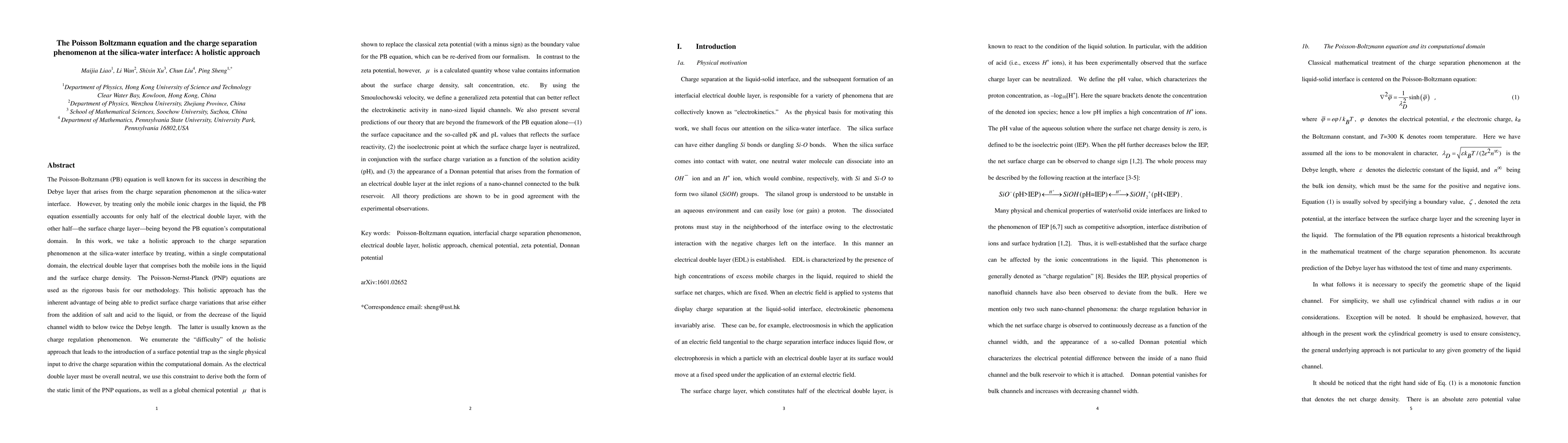 The Poisson Boltzmann equation is known for its success in describing the Debye layer that arises from the charge separation phenomenon at the silica/water interface. However, by treating only the mobile ionic charges in the liquid, the Poisson Boltzmann equation accounts for only half of the electrical double layer, with the other half, the surface charge layer, being beyond its computational domain. In this work, we take a holistic approach to the charge separation phenomenon at the silica/water interface by treating, within a single computational domain, the electrical double layer that comprises both the mobile ions in the liquid and the surface charge density. The Poisson Nernst Planck equations are used as the rigorous basis for our methodology. The holistic approach has the advantage of being able to predict surface charge variations that arise either from the addition of salt and acid to the liquid, or from the decrease of the liquid channel width to below twice the Debye length. As the electrical double layer must be overall neutral, we use this constraint to derive both the form of the static limit of the Poisson Nernst Planck equations, as well as a global chemical potential that replaces the classical zeta potential as the boundary value for the PB equation, which can be re-derived from our formalism. We present several predictions of our theory that are beyond the framework of the PB equation alone, e.g., the surface capacitance and the so-called pK and pL values, the isoelectronic point at which the surface charge layer is neutralized, and the appearance of a Donnan potential that arises from the formation of an electrical double layer at the inlet regions of a nano-channel connected to the bulk reservoir. All theory predictions are shown to be in good agreement with the experimental observations.