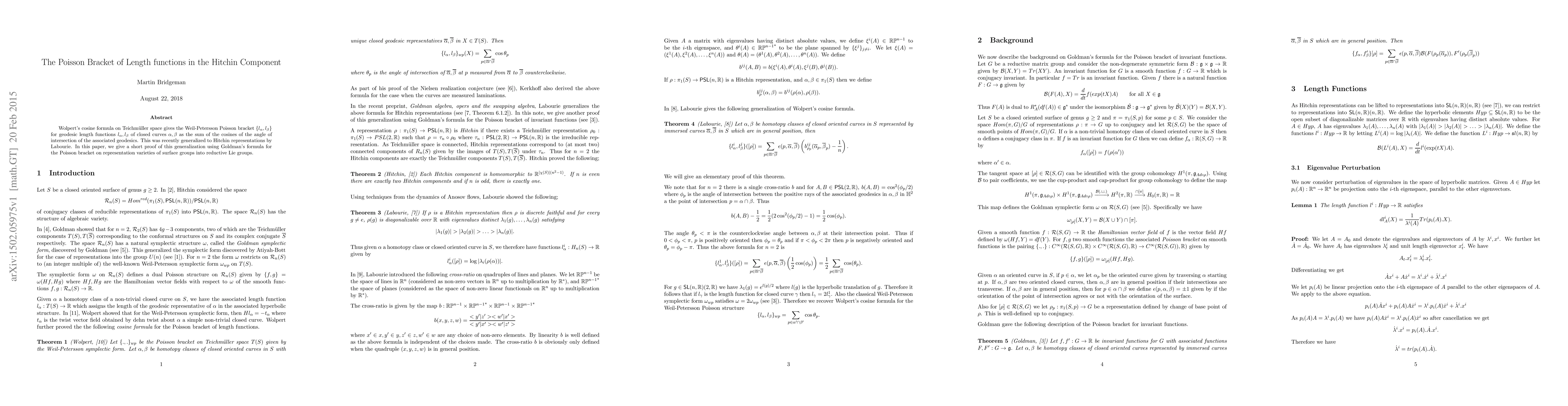 Wolpert's cosine formula on Teichm\"uller space gives the Weil-Petersson Poisson bracket $\{l_\alpha, l_\beta\}$ for geodesic length functions $l_\alpha,l_\beta$ of closed curves $\alpha,\beta$ as the sum of the cosines of the angle of intersection of the associated geodesics. This was recently generalized to Hitchin representations by Labourie. In this paper, we give a short proof of this generalization using Goldman's formula for the Poisson bracket on representation varieties of surface groups into reductive Lie groups.