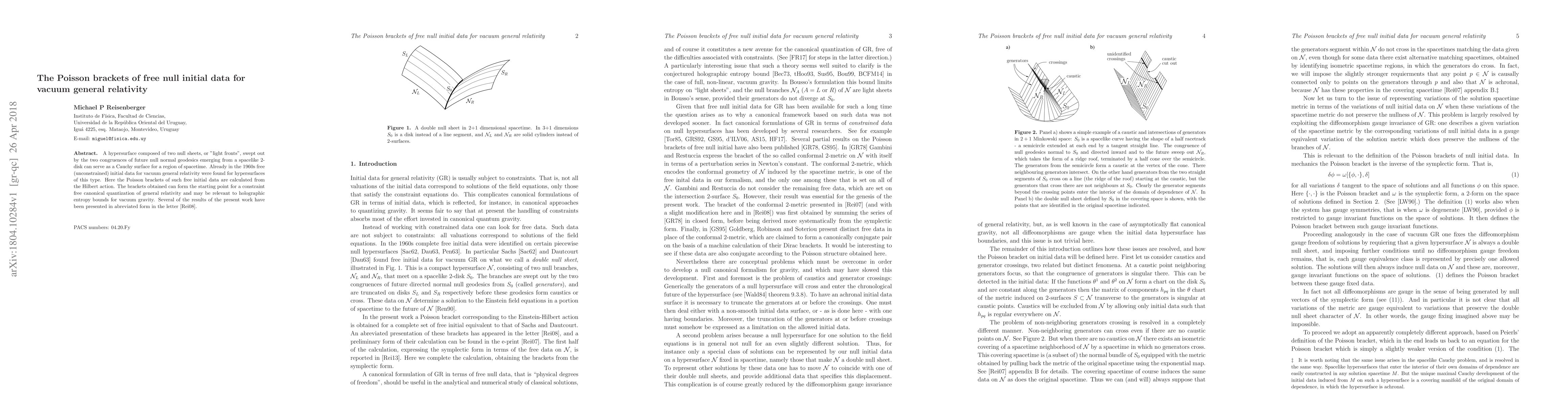 A hypersurface composed of two null sheets, or "light fronts", swept out by the two congruences of future null normal geodesics emerging from a spacelike 2-disk can serve as a Cauchy surface for a region of spacetime. Already in the 1960s free (unconstrained) initial data for vacuum general relativity were found for hypersurfaces of this type. Here the Poisson brackets of such free initial data are calculated from the Hilbert action. The brackets obtained can form the starting point for a constraint free canonical quantization of general relativity and may be relevant to holographic entropy bounds for vacuum gravity. Several of the results of the present work have been presented in abbreviated form in the letter [Rei08].