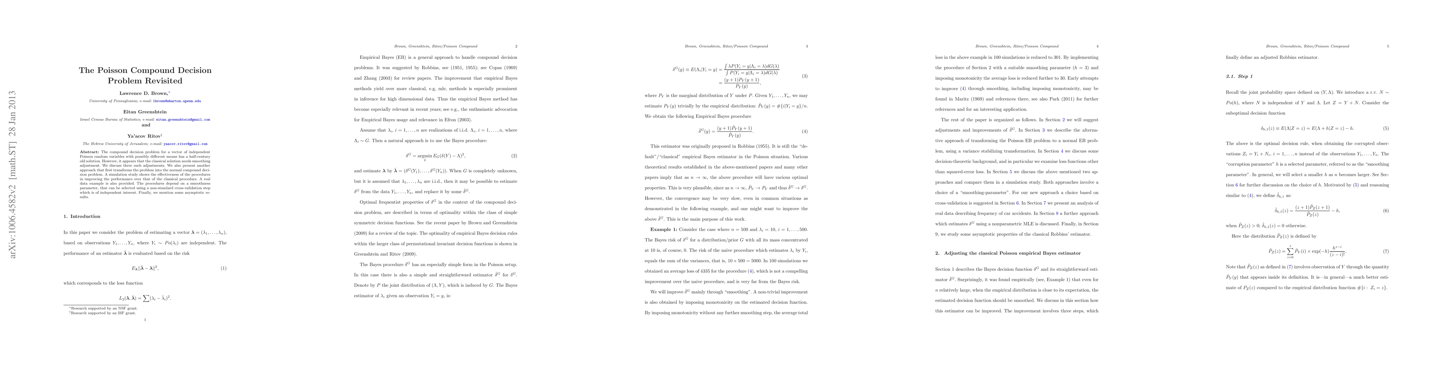 The paper revisits the compound decision problem for independent Poisson random variables with different means, proposing adjustments to the classical solution and an alternative approach transforming the problem into a normal compound decision problem.
