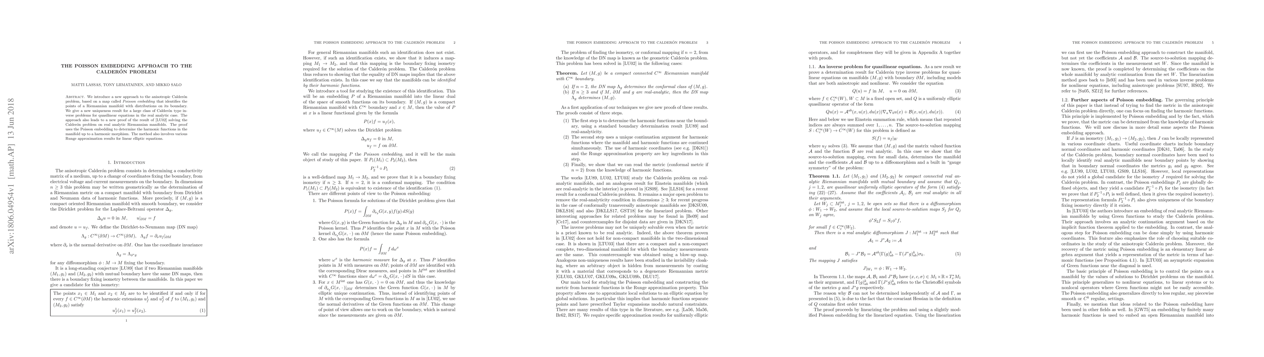 We introduce a new approach to the anisotropic Calder\'on problem, based on a map called Poisson embedding that identifies the points of a Riemannian manifold with distributions on its boundary. We give a new uniqueness result for a large class of Calder\'on type inverse problems for quasilinear equations in the real analytic case. The approach also leads to a new proof of the result by Lassas and Uhlmann (2001) solving the Calder\'on problem on real analytic Riemannian manifolds. The proof uses the Poisson embedding to determine the harmonic functions in the manifold up to a harmonic morphism. The method also involves various Runge approximation results for linear elliptic equations.