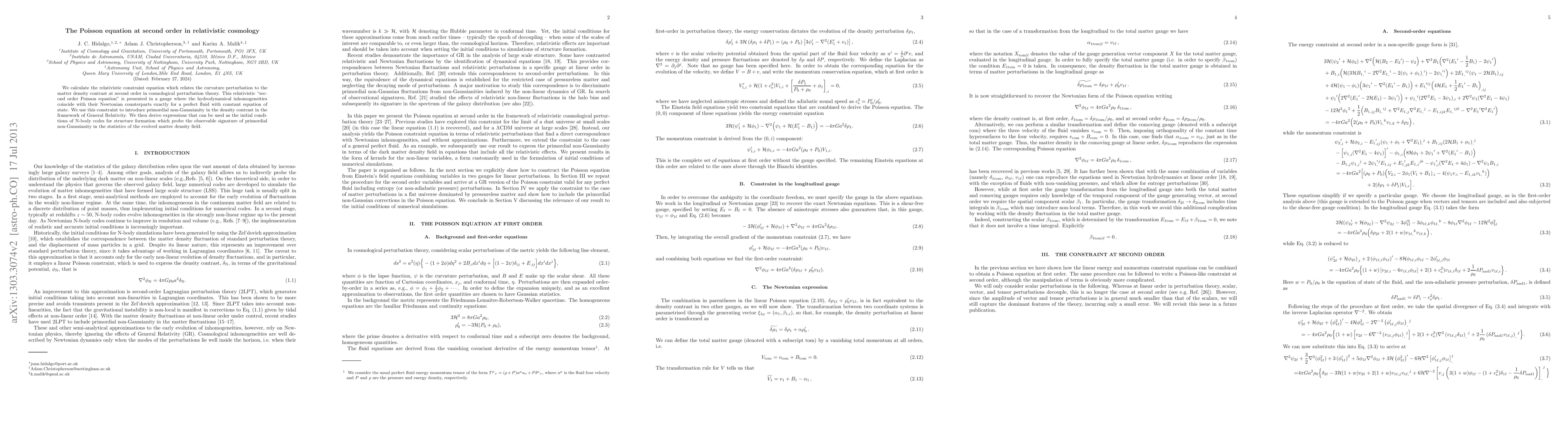 We calculate the relativistic constraint equation which relates the curvature perturbation to the matter density contrast at second order in cosmological perturbation theory. This relativistic "second order Poisson equation" is presented in a gauge where the hydrodynamical inhomogeneities coincide with their Newtonian counterparts exactly for a perfect fluid with constant equation of state. We use this constraint to introduce primordial non-Gaussianity in the density contrast in the framework of General Relativity. We then derive expressions that can be used as initial conditions of N-body codes for structure formation which probe the observable signature of primordial non-Gaussianity in the statistics of the evolved matter density field.
