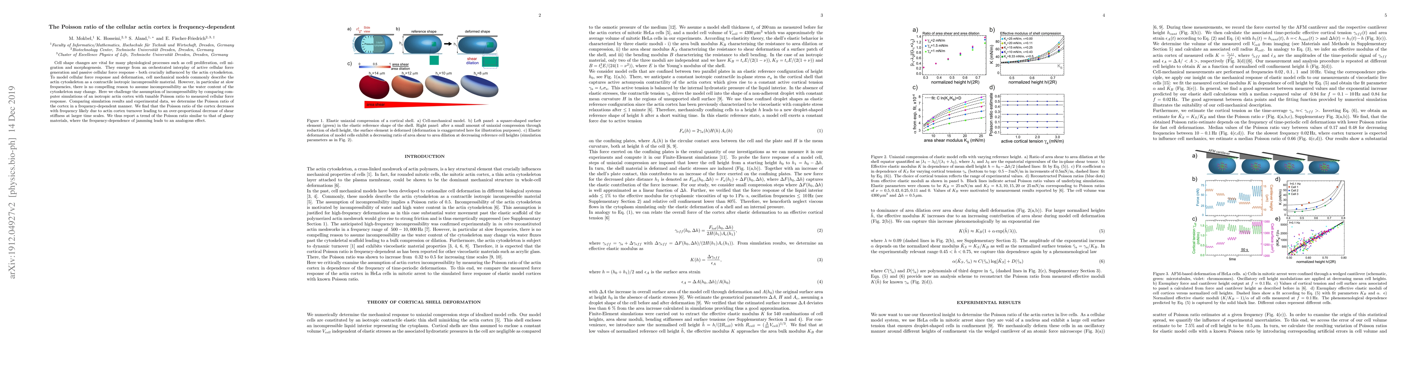 This study investigates the frequency-dependent Poisson ratio of the cellular actin cortex, revealing that it decreases with increasing frequency. The findings suggest that actin cortex turnover causes a disproportionate decrease in shear stiffness at slower frequencies, challenging the common assumption of incompressibility in cellular mechanical models.