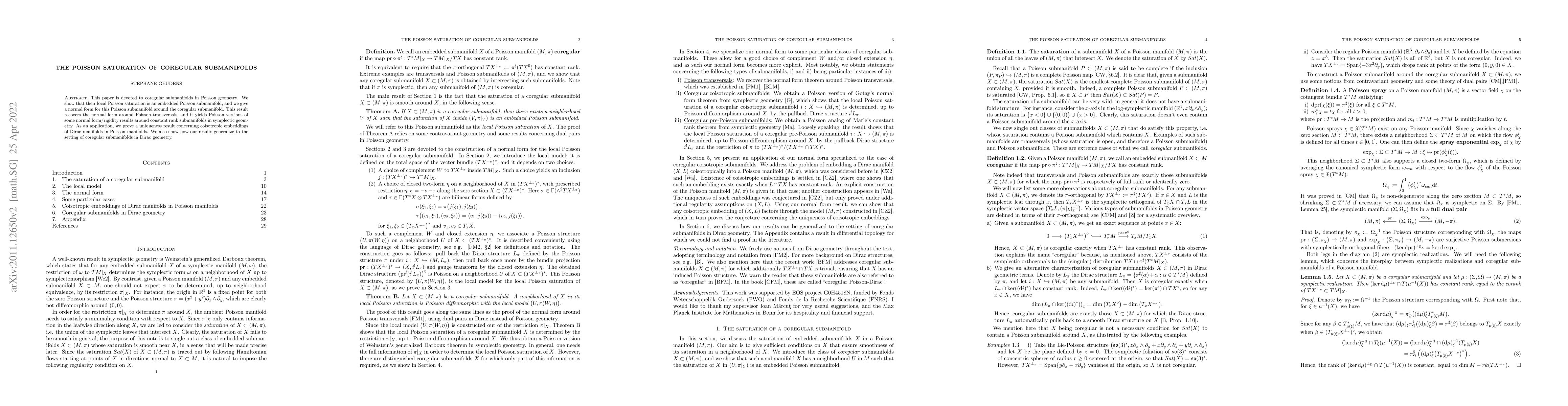 This paper explores coregular submanifolds in Poisson geometry, proving their local Poisson saturation forms an embedded Poisson submanifold and presenting a normal form for this structure. It generalizes results from symplectic geometry and applies to coisotropic embeddings in Poisson manifolds, extending to Dirac geometry as well.