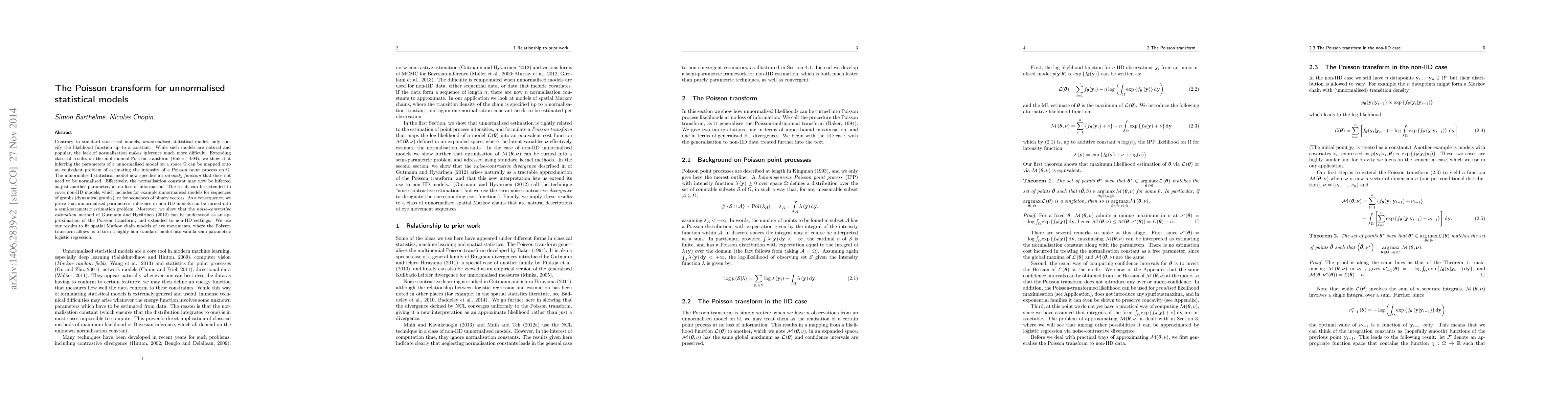 This paper introduces the Poisson transform for unnormalised statistical models, mapping parameter inference to estimating the intensity of a Poisson point process. This approach allows unnormalised models to infer the normalisation constant as a parameter, facilitating semi-parametric estimation in non-independent and identically distributed (non-IID) settings.