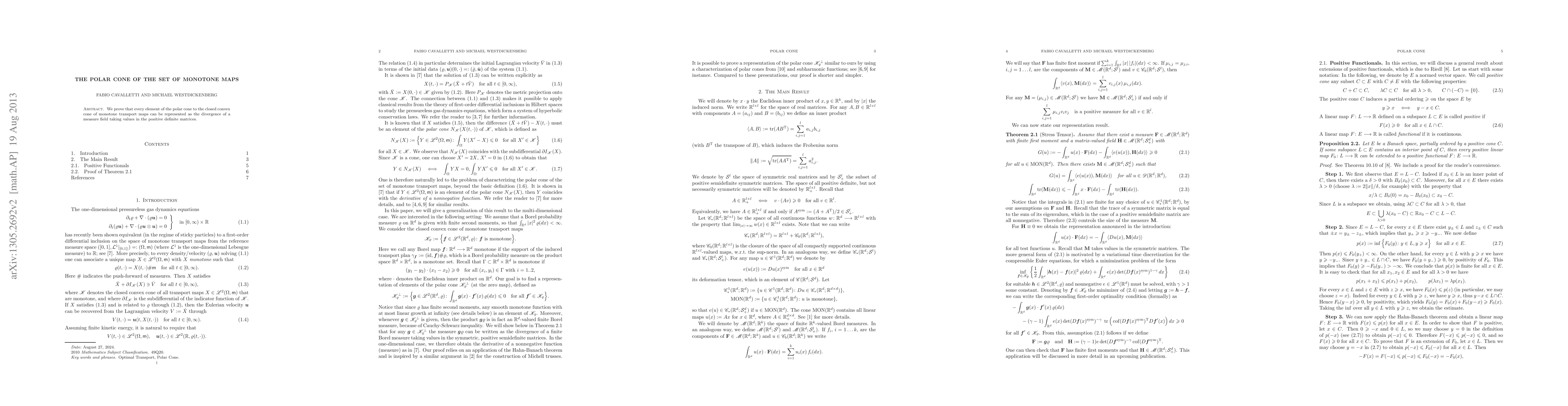 Summary: This paper demonstrates that any element in the polar cone of the closed convex cone of monotone transport maps corresponds to the divergence of a measure field with values in positive definite matrices. The result provides a structural representation of these elements.