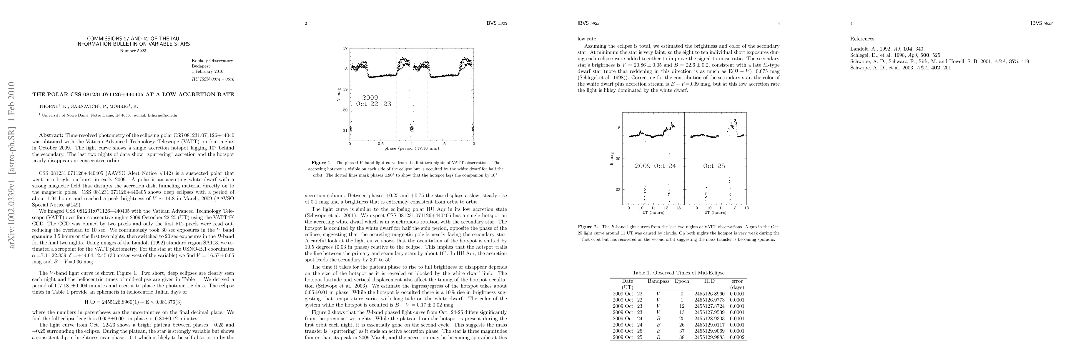 Time-resolved photometry of the eclipsing polar CSS 081231:071126+44040 was obtained with the Vatican Advanced Technology Telescope (VATT) on four nights in October 2009. The light curve shows a single accretion hotspot lagging 10 degrees behind the secondary. The last two nights of data show "sputtering" accretion and the hotspot nearly disappears in consecutive orbits.