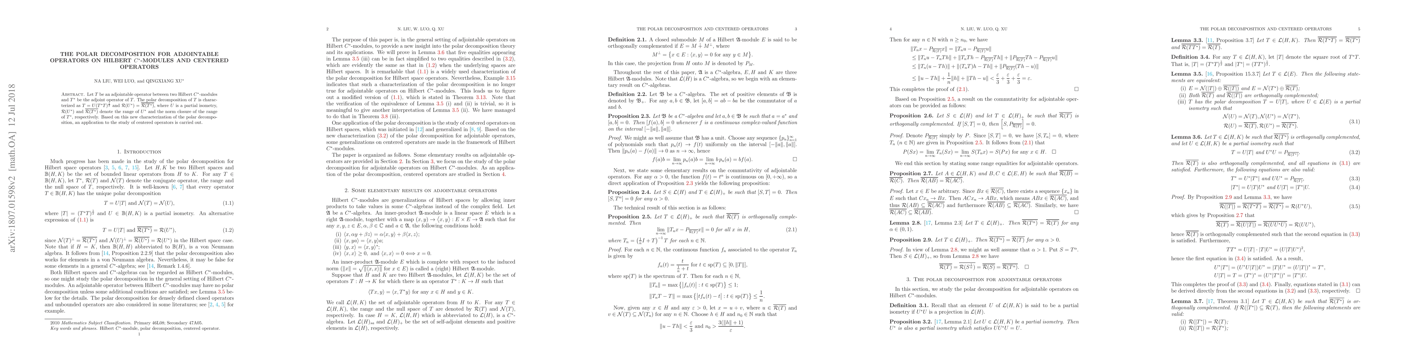 The paper presents a detailed analysis of the polar decomposition for adjointable operators on Hilbert C*-modules, including characterizations, criteria, and proofs of equivalence conditions.