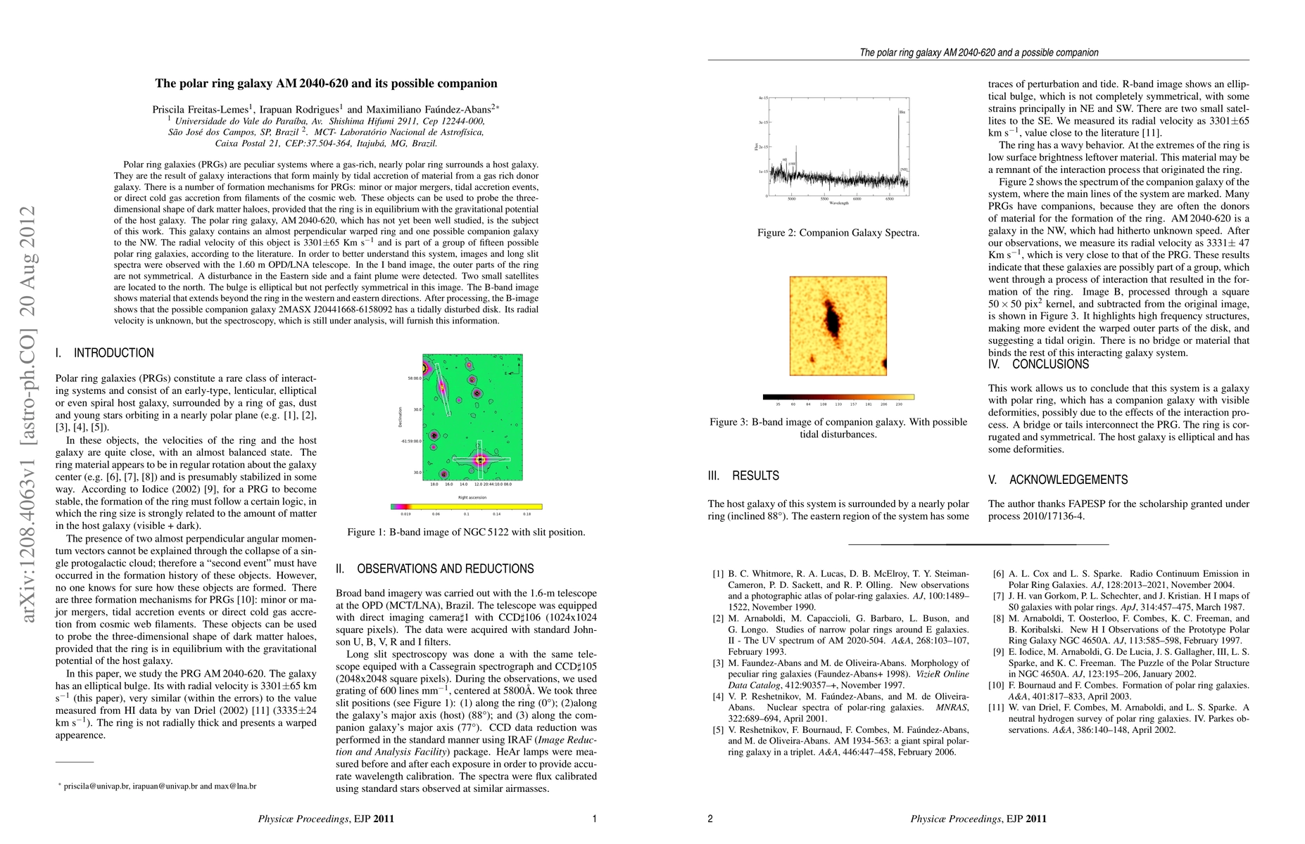 Polar ring galaxies (PRGs) are peculiar systems where a gas-rich, nearly polar ring surrounds a host galaxy. They are the result of galaxy interactions that form mainly by tidal accretion of material from a gas rich donor galaxy. There is a number of formation mechanisms for PRGs: minor or major mergers, tidal accretion events, or direct cold gas accretion from filaments of the cosmic web. These objects can be used to probe the three-dimensional shape of dark matter haloes, provided that the ring is in equilibrium with the gravitational potential of the host galaxy. The polar ring galaxy, AM 2040-620, which has not yet been well studied, is the subject of this work. This galaxy contains an almost perpendicular warped ring and one possible companion galaxy to the NW. The radial velocity of this object is 3301\pm65 km/s and is part of a group of fifteen possible polar ring galaxies, according to the literature. In order to better understand this system, images and long slit spectra were observed with the 1.60 m OPD/LNA telescope. In the I band image, the outer parts of the ring are not symmetrical. A disturbance in the Eastern side and a faint plume were detected. Two small satellites are located to the north. The bulge is elliptical but not perfectly symmetrical in this image. The B-band image shows material that extends beyond the ring in the western and eastern directions. After processing, the B-image shows that the possible companion galaxy 2MASX J20441668-6158092 has a tidally disturbed disk. Its radial velocity is unknown, but the spectroscopy, which is still under analysis, will furnish this information.