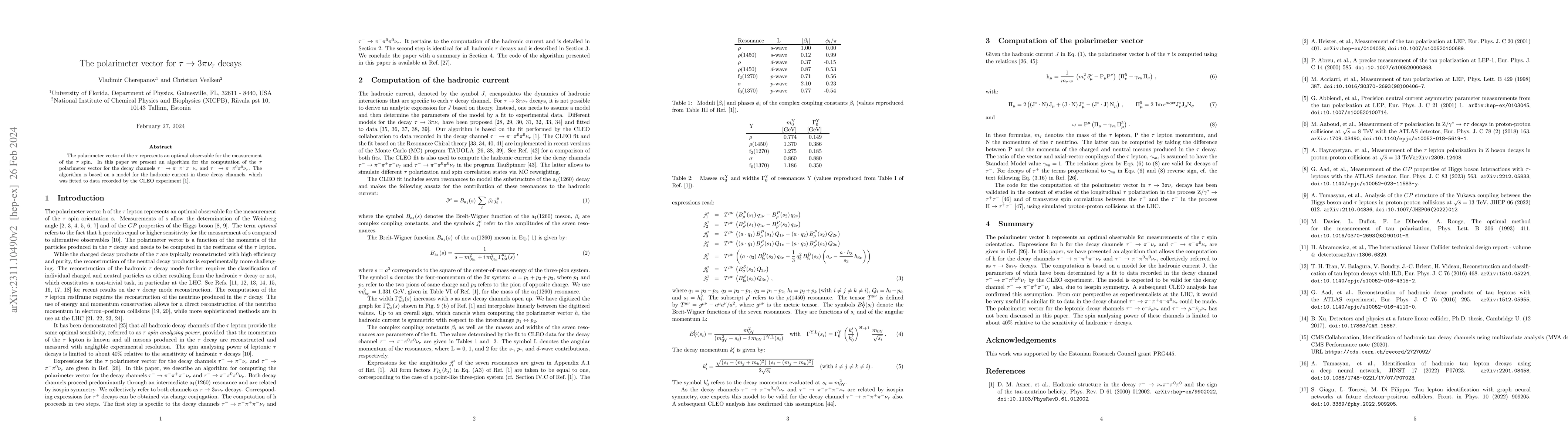 The polarimeter vector of the $\tau$ represents an optimal observable for the measurement of the $\tau$ spin. In this paper we present an algorithm for the computation of the $\tau$ polarimeter vector for the decay channels $\tau^{-} \rightarrow \pi^{-}\pi^{+}\pi^{-}\nu_{\tau}$ and $\tau^{-} \rightarrow \pi^{-}\pi^{0}\pi^{0}\nu_{\tau}$. The algorithm is based on a model for the hadronic current in these decay channels, which was fitted to data recorded by the CLEO experiment.