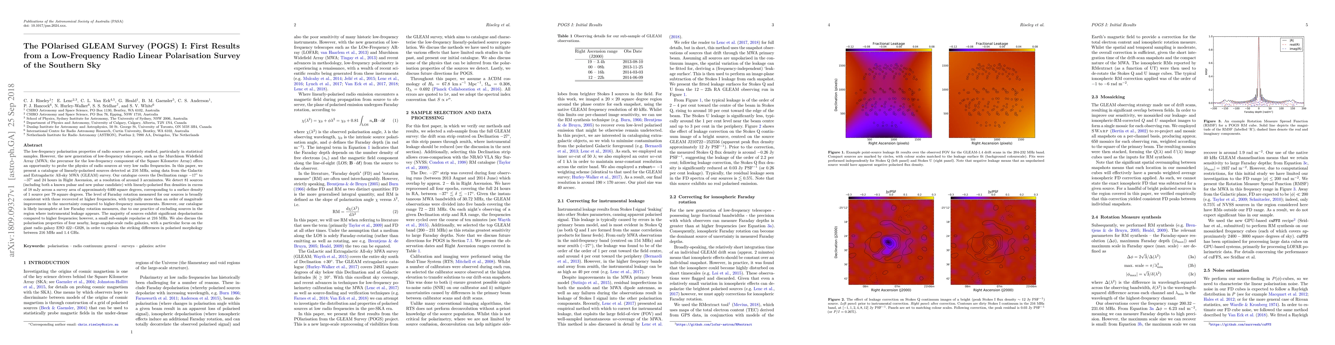 This study presents the first results from the POlarised GLEAM Survey (POGS), revealing a catalogue of 81 linearly-polarised sources at 216 MHz over 6400 square degrees. The research, using data from the Galactic and Extragalactic All-sky MWA (GLEAM) survey, finds consistent Faraday rotation measures with higher frequencies but improved uncertainties. Most sources show significant depolarisation at 216 MHz compared to higher frequencies, with a sub-sample repolarising. The paper also discusses the polarisation properties of nearby radio galaxies, focusing on ESO 422-G028.