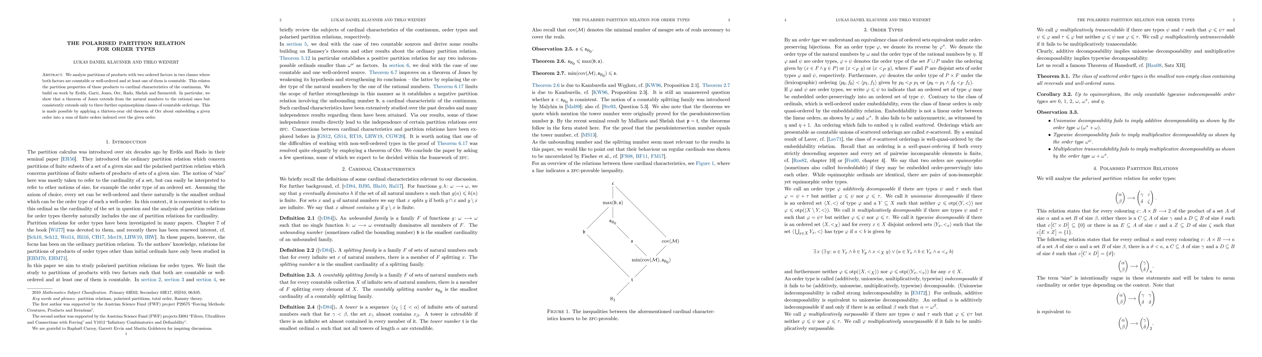 We analyse partitions of products with two ordered factors in two classes where both factors are countable or well-ordered and at least one of them is countable. This relates the partition properties of these products to cardinal characteristics of the continuum. We build on work by Erd\H{o}s, Garti, Jones, Orr, Rado, Shelah and Szemer\'edi. In particular, we show that a theorem of Jones extends from the natural numbers to the rational ones but consistently extends only to three further equimorphism classes of countable orderings. This is made possible by applying a thirteen-year old theorem of Orr about embedding a given order into a sum of finite orders indexed over the given order.