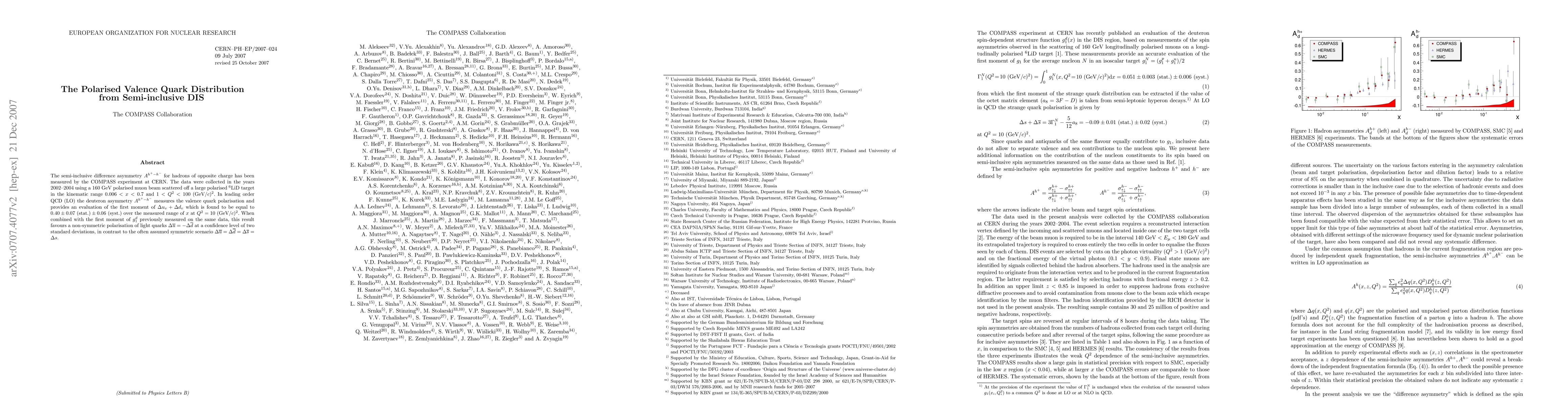 The semi-inclusive difference asymmetry A^{h^{+}-h^{-}} for hadrons of opposite charge has been measured by the COMPASS experiment at CERN. The data were collected in the years 2002-2004 using a 160 GeV polarised muon beam scattered off a large polarised ^6LiD target and cover the range 0.006 < x < 0.7 and 1 < Q^2 < 100 (GeV/c)^2. In leading order QCD (LO) the asymmetry A_d^{h^{+}-h^{-}} measures the valence quark polarisation and provides an evaluation of the first moment of Delta u_v + Delta d_v which is found to be equal to 0.40 +- 0.07 (stat.) +- 0.05 (syst.) over the measured range of x at Q^2 = 10 (GeV/c)^2. When combined with the first moment of g_1^d previously measured on the same data, this result favours a non-symmetric polarisation of light quarks Delta u-bar = - Delta d-bar at a confidence level of two standard deviations, in contrast to the often assumed symmetric scenario Delta u-bar = Delta d-bar = Delta s-bar = Delta s.