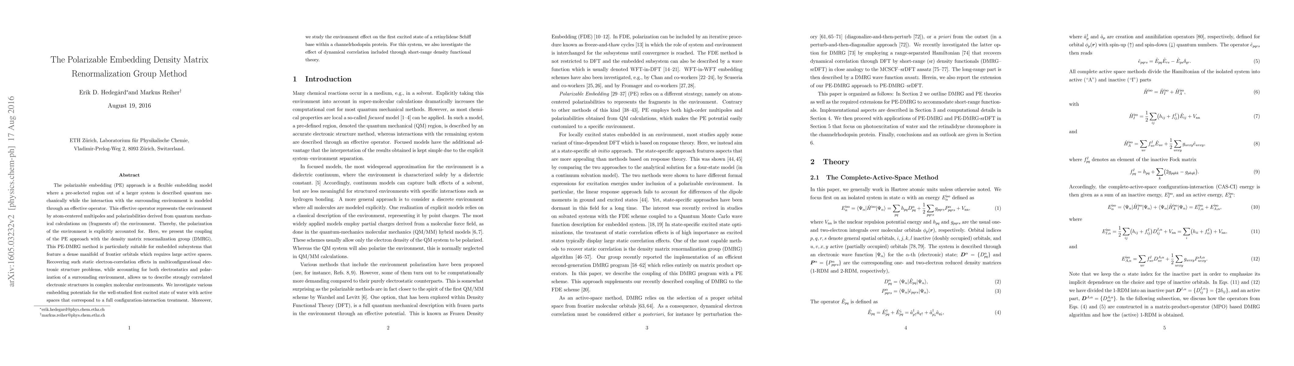 The paper introduces the polarizable embedding (PE) approach combined with density matrix renormalization group (DMRG) to handle complex, multiconfigurational electronic structures in large molecular systems. The PE-DMRG method effectively captures both electrostatic and polarization effects of the environment, demonstrating its utility in describing the first excited state of water and a retinylidene Schiff base within a protein environment.
