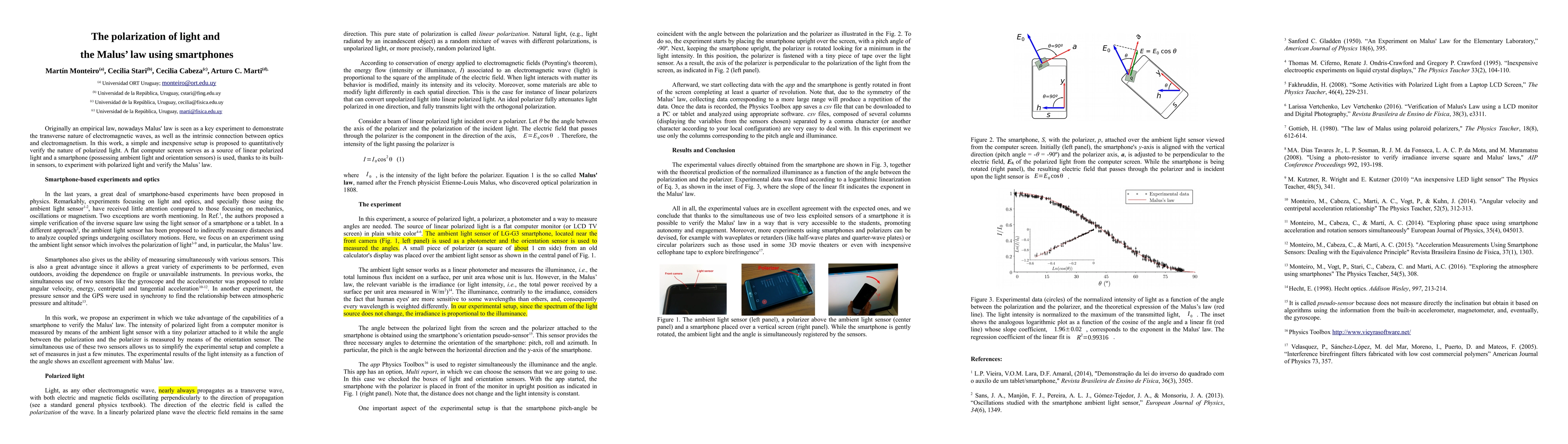 Originally an empirical law, nowadays Malus' law is seen as a key experiment to demonstrate the transverse nature of electromagnetic waves, as well as the intrinsic connection between optics and electromagnetism. In this work, a simple and inexpensive setup is proposed to quantitatively verify the nature of polarized light. A flat computer screen serves as a source of linear polarized light and a smartphone (possessing ambient light and orientation sensors) is used, thanks to its built-in sensors, to experiment with polarized light and verify the Malus' law.