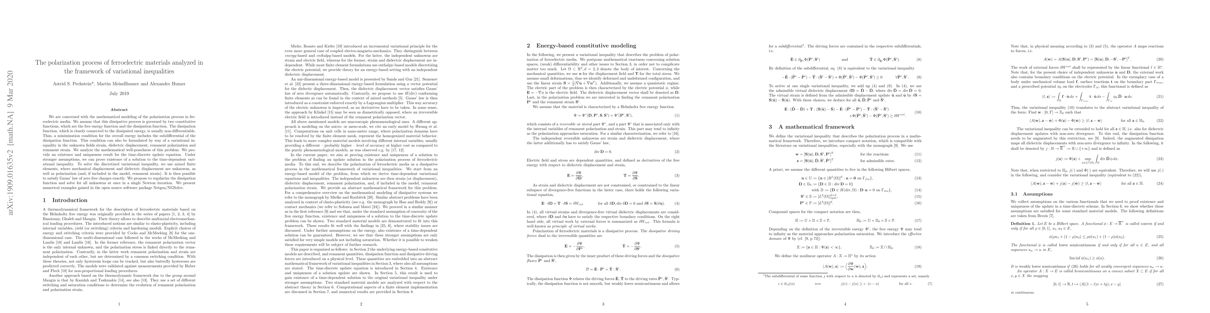 We are concerned with the mathematical modeling of the polarization process in ferroelectric media. We assume that this dissipative process is governed by two constitutive functions, which are the free energy function and the dissipation function. The dissipation function, which is closely connected to the dissipated energy, is usually non-differentiable. Thus, a minimization condition for the overall energy includes the subdifferential of the dissipation function. This condition can also be formulated by way of a variational inequality in the unknown fields strain, dielectric displacement, remanent polarization and remanent strain. We analyze the mathematical well-posedness of this problem. We provide an existence and uniqueness result for the time-discrete update equation. Under stronger assumptions, we can prove existence of a solution to the time-dependent variational inequality. To solve the discretized variational inequality, we use mixed finite elements, where mechanical displacement and dielectric displacement are unknowns, as well as polarization (and, if included in the model, remanent strain). It is then possible to satisfy Gauss' law of zero free charges exactly. We propose to regularize the dissipation function and solve for all unknowns at once in a single Newton iteration. We present numerical examples gained in the open source software package Netgen/NGSolve.