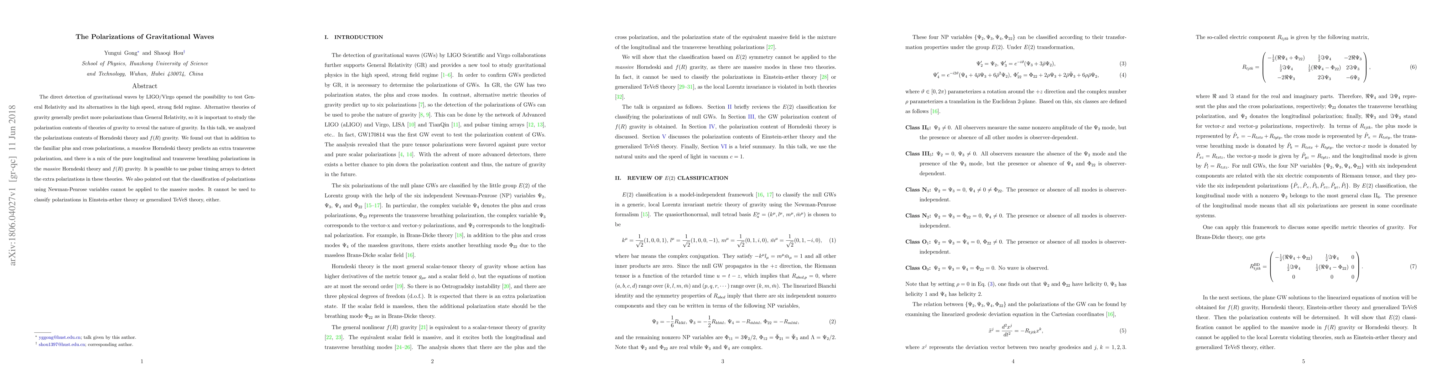 The direct detection of gravitational waves by LIGO/Virgo opened the possibility to test General Relativity and its alternatives in the high speed, strong field regime. Alternative theories of gravity generally predict more polarizations than General Relativity, so it is important to study the polarization contents of theories of gravity to reveal the nature of gravity. In this talk, we analyzed the polarizations contents of Horndeski theory and $f(R)$ gravity. We found out that in addition to the familiar plus and cross polarizations, a \emph{massless} Horndeski theory predicts an extra transverse polarization, and there is a mix of the pure longitudinal and transverse breathing polarizations in the \emph{massive} Horndeski theory and $f(R)$ gravity. It is possible to use pulsar timing arrays to detect the extra polarizations in these theories. We also pointed out that the classification of polarizations using Newman-Penrose variables cannot be applied to the massive modes. It cannot be used to classify polarizations in Einstein-\ae ther theory or generalized TeVeS theory, either.