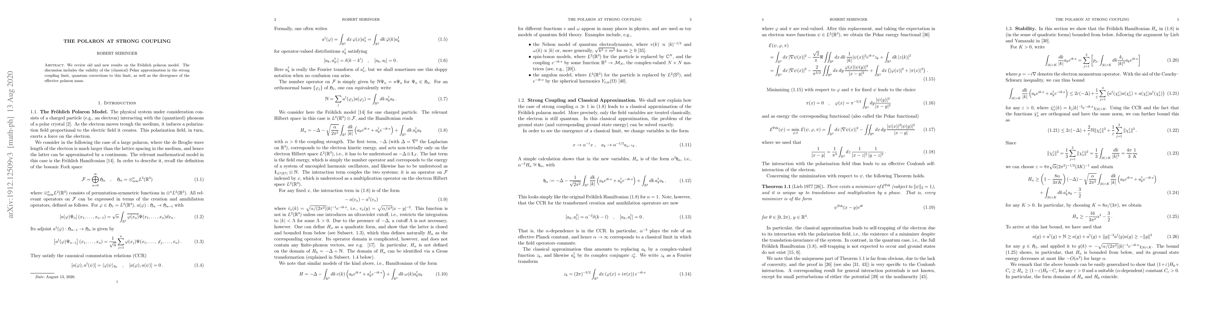 We review old and new results on the Fr\"ohlich polaron model. The discussion includes the validity of the (classical) Pekar approximation in the strong coupling limit, quantum corrections to this limit, as well as the divergence of the effective polaron mass.