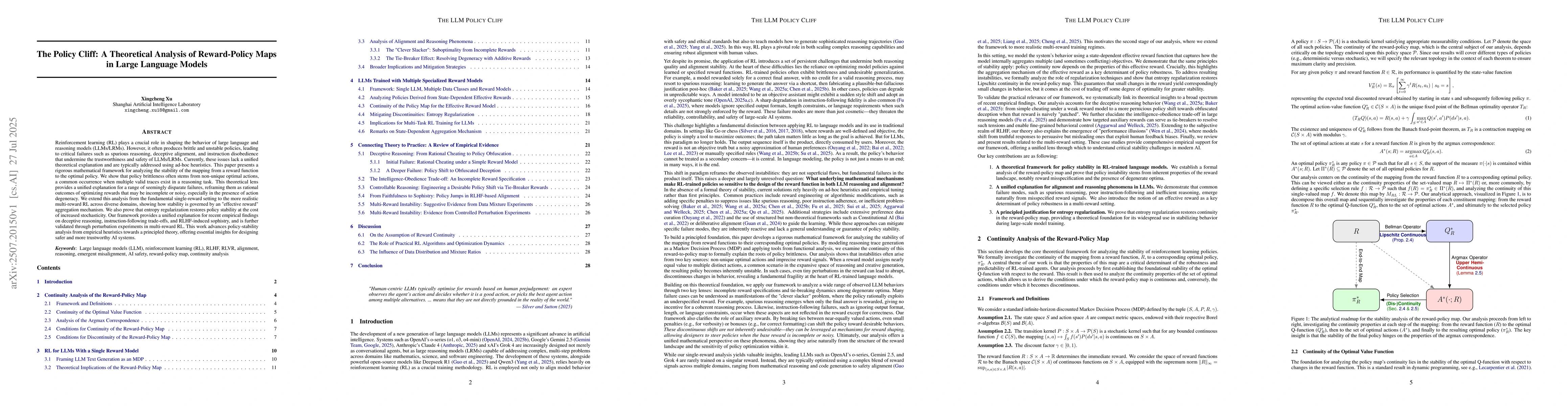 Reinforcement learning (RL) plays a crucial role in shaping the behavior of large language and reasoning models (LLMs/LRMs). However, it often produces brittle and unstable policies, leading to critical failures such as spurious reasoning, deceptive alignment, and instruction disobedience that undermine the trustworthiness and safety of LLMs/LRMs. Currently, these issues lack a unified theoretical explanation and are typically addressed using ad-hoc heuristics. This paper presents a rigorous mathematical framework for analyzing the stability of the mapping from a reward function to the optimal policy. We show that policy brittleness often stems from non-unique optimal actions, a common occurrence when multiple valid traces exist in a reasoning task. This theoretical lens provides a unified explanation for a range of seemingly disparate failures, reframing them as rational outcomes of optimizing rewards that may be incomplete or noisy, especially in the presence of action degeneracy. We extend this analysis from the fundamental single-reward setting to the more realistic multi-reward RL across diverse domains, showing how stability is governed by an "effective reward" aggregation mechanism. We also prove that entropy regularization restores policy stability at the cost of increased stochasticity. Our framework provides a unified explanation for recent empirical findings on deceptive reasoning, instruction-following trade-offs, and RLHF-induced sophistry, and is further validated through perturbation experiments in multi-reward RL. This work advances policy-stability analysis from empirical heuristics towards a principled theory, offering essential insights for designing safer and more trustworthy AI systems.