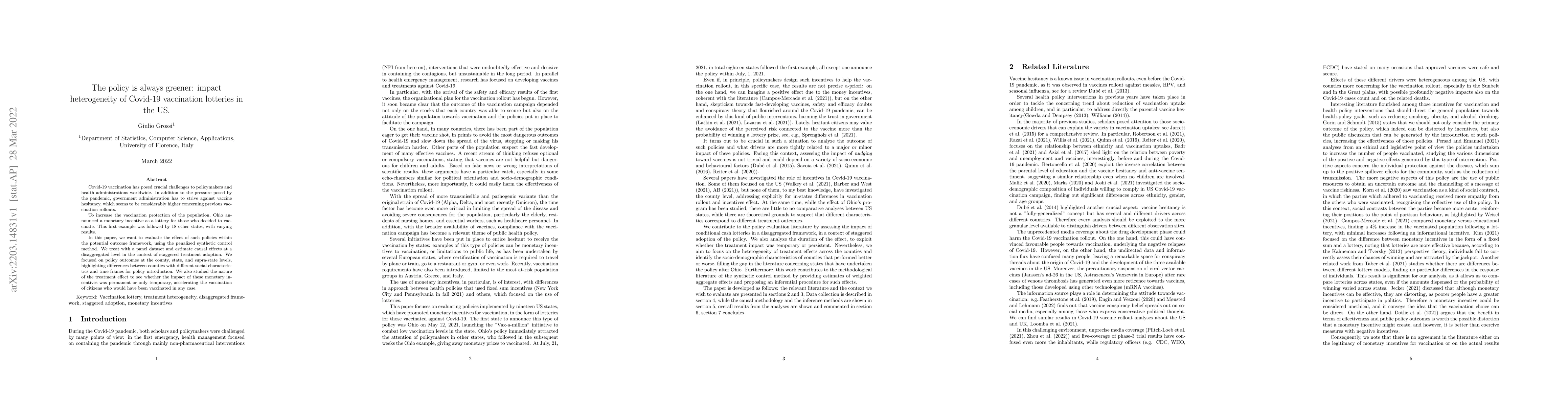 Covid-19 vaccination has posed crucial challenges to policymakers and health administrations worldwide. In addition to the pressure posed by the pandemic, government administration has to strive against vaccine hesitancy, which seems to be considerably higher concerning previous vaccination rollouts. To increase the vaccination protection of the population, Ohio announced a monetary incentive as a lottery for those who decided to vaccinate. This first example was followed by 18 other states, with varying results. In this paper, we want to evaluate the effect of such policies within the potential outcome framework, using the penalized synthetic control method. We treat with a panel dataset and estimate causal effects at a disaggregated level in the context of staggered treatment adoption. We focused on policy outcomes at the county, state, and supra-state levels, highlighting differences between counties with different social characteristics and time frames for policy introduction. We also studied the nature of the treatment effect to see whether the impact of these monetary incentives was permanent or only temporary, accelerating the vaccination of citizens who would have been vaccinated in any case.