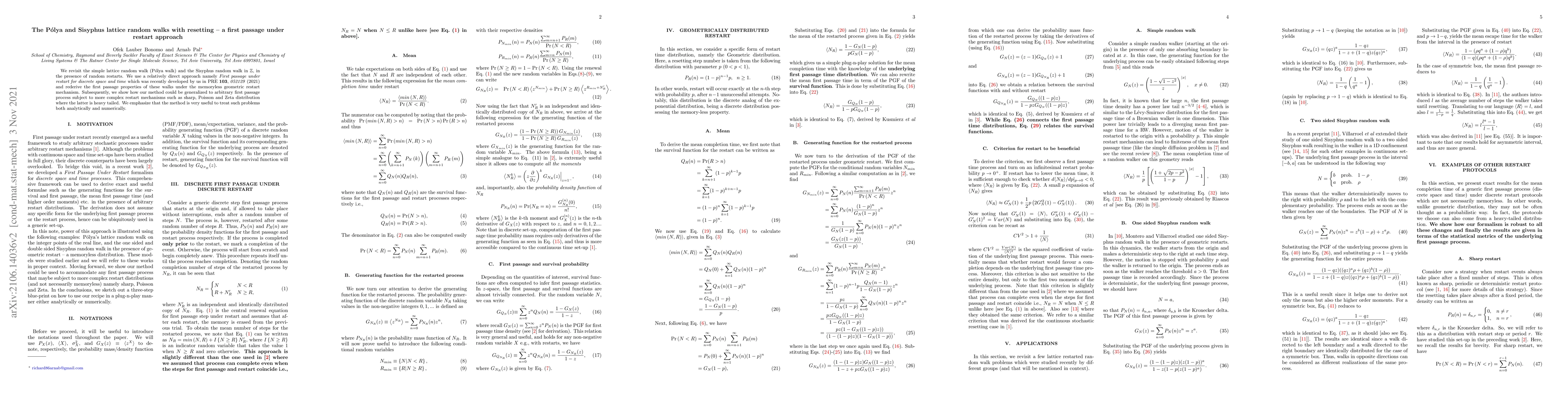 We revisit the simple lattice random walk (P\'{o}lya walk) and the Sisyphus random walk in $\mathbb{Z}$, in the presence of random restarts. We use a relatively direct approach namely First passage under restart for discrete space and time which was recently developed by us in PRE 103, 052129 (2021) and rederive the first passage properties of these walks under the memoryless geometric restart mechanism. Subsequently, we show how our method could be generalized to arbitrary first passage process subject to more complex restart mechanisms such as sharp, Poisson and Zeta distribution where the latter is heavy tailed. We emphasize that the method is very useful to treat such problems both analytically and numerically.