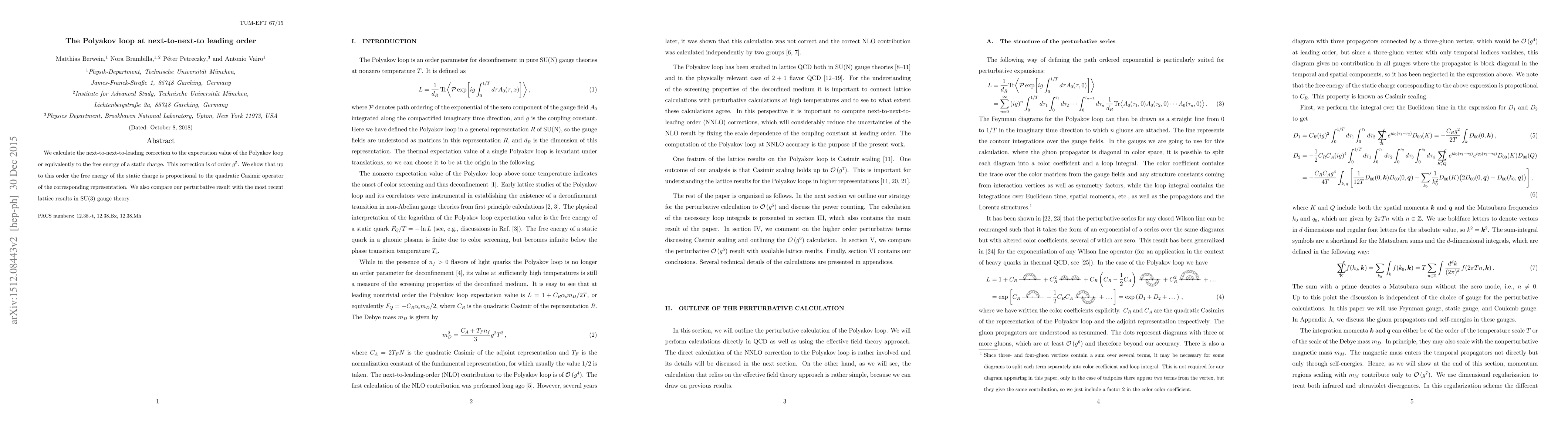 This paper calculates the next-to-next-to-leading order correction to the Polyakov loop's expectation value, showing a $g^5$ order effect. It demonstrates that the static charge's free energy is proportional to the quadratic Casimir operator up to this order and compares the perturbative results with recent lattice data in SU(3) gauge theory.