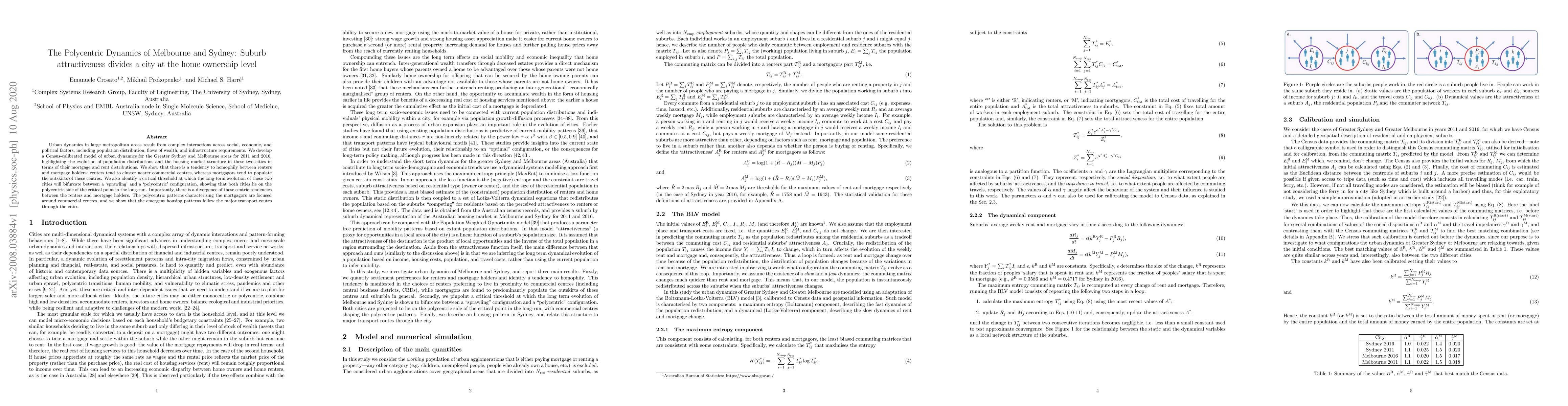 Urban dynamics in large metropolitan areas result from complex interactions across social, economic, and political factors, including population distribution, flows of wealth, and infrastructure requirements. We develop a Census-calibrated model of urban dynamics for the Greater Sydney and Melbourne areas for 2011 and 2016, highlighting the evolution of population distributions and the housing market structure in these two cities in terms of their mortgage and rent distributions. We show that there is a tendency to homophily between renters and mortgage holders: renters tend to cluster nearer commercial centres, whereas mortgagors tend to populate the outskirts of these centres. We also identify a critical threshold at which the long-term evolution of these two cities will bifurcate between a `sprawling' and a `polycentric' configuration, showing that both cities lie on the polycentric side of the critical point in the long-run. Importantly, there is a divergence of these centric tendencies between the renters and mortgage holders. The polycentric patterns characterising the mortgagors are focused around commercial centres, and we show that the emergent housing patterns follow the major transport routes through the cities.