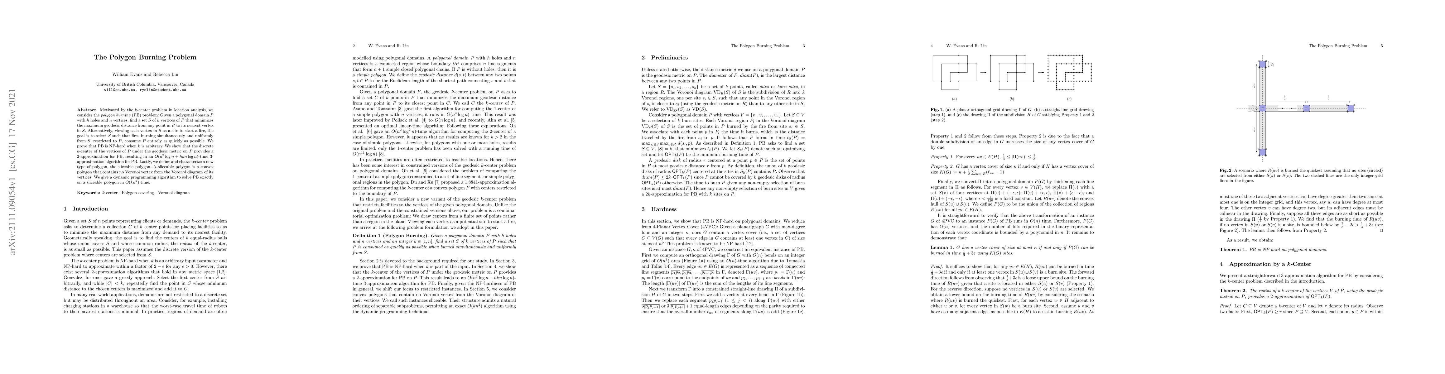 Motivated by the $k$-center problem in location analysis, we consider the \emph{polygon burning} (PB) problem: Given a polygonal domain $P$ with $h$ holes and $n$ vertices, find a set $S$ of $k$ vertices of $P$ that minimizes the maximum geodesic distance from any point in $P$ to its nearest vertex in $S$. Alternatively, viewing each vertex in $S$ as a site to start a fire, the goal is to select $S$ such that fires burning simultaneously and uniformly from $S$, restricted to $P$, consume $P$ entirely as quickly as possible. We prove that PB is NP-hard when $k$ is arbitrary. We show that the discrete $k$-center of the vertices of $P$ under the geodesic metric on $P$ provides a $2$-approximation for PB, resulting in an $O(n^2 \log n + hkn \log n)$-time $3$-approximation algorithm for PB. Lastly, we define and characterize a new type of polygon, the sliceable polygon. A sliceable polygon is a convex polygon that contains no Voronoi vertex from the Voronoi diagram of its vertices. We give a dynamic programming algorithm to solve PB exactly on a sliceable polygon in $O(kn^2)$ time.