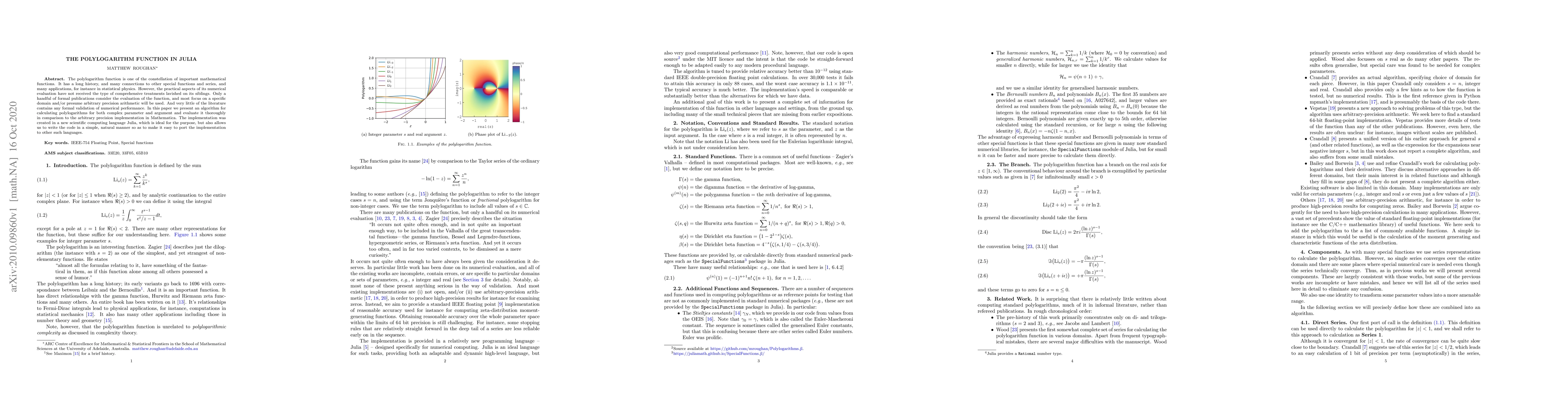 The polylogarithm function is one of the constellation of important mathematical functions. It has a long history, and many connections to other special functions and series, and many applications, for instance in statistical physics. However, the practical aspects of its numerical evaluation have not received the type of comprehensive treatments lavished on its siblings. Only a handful of formal publications consider the evaluation of the function, and most focus on a specific domain and/or presume arbitrary precision arithmetic will be used. And very little of the literature contains any formal validation of numerical performance. In this paper we present an algorithm for calculating polylogarithms for both complex parameter and argument and evaluate it thoroughly in comparison to the arbitrary precision implementation in Mathematica. The implementation was created in a new scientific computing language Julia, which is ideal for the purpose, but also allows us to write the code in a simple, natural manner so as to make it easy to port the implementation to other such languages.