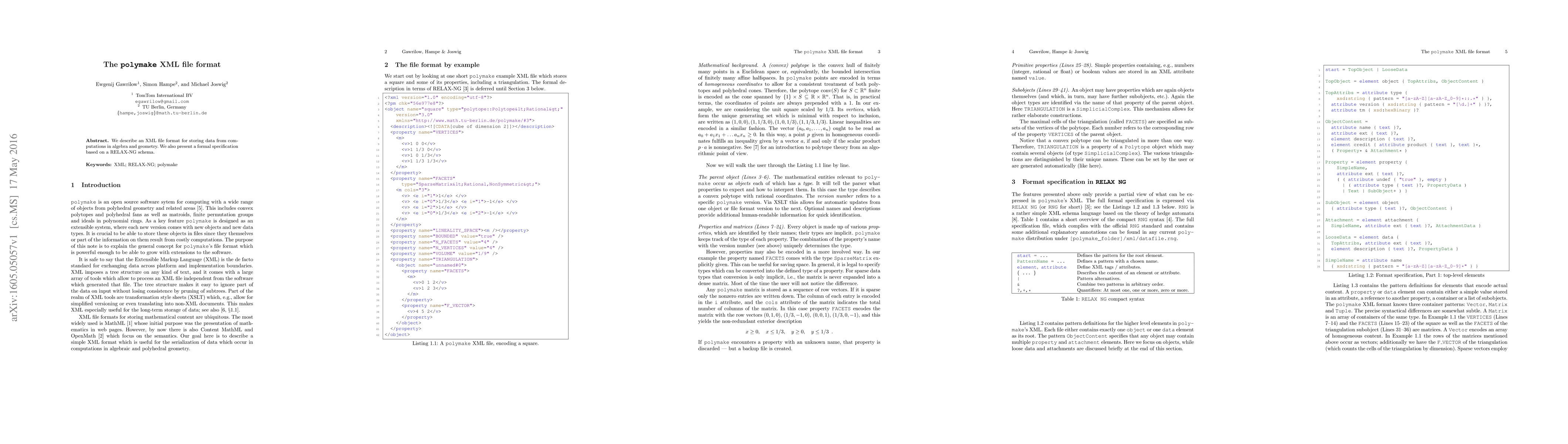 Summary: This paper introduces an XML file format for storing computational data in algebra and geometry, accompanied by a formal specification using a RELAX-NG schema to ensure data integrity and structure.