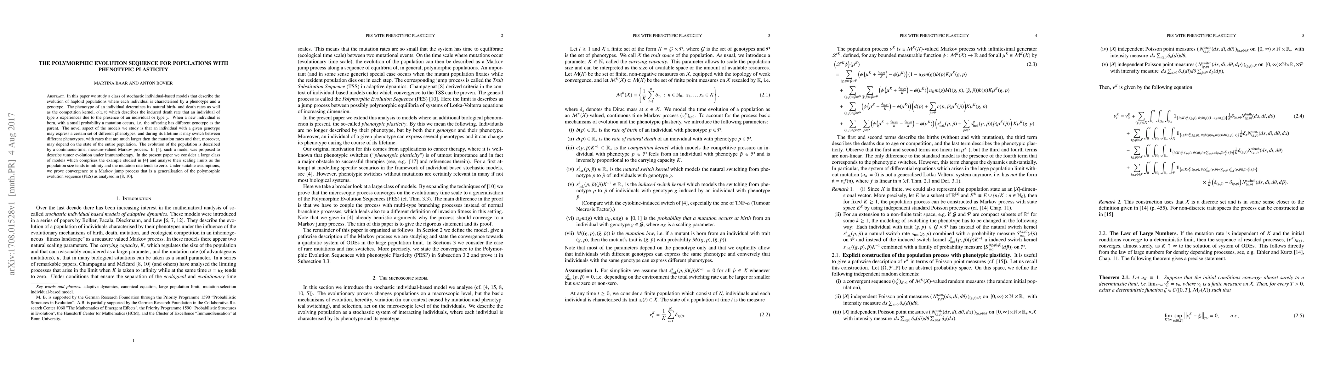 In this paper we study a class of stochastic individual-based models that describe the evolution of haploid populations where each individual is characterised by a phenotype and a genotype. The phenotype of an individual determines its natural birth- and death rates as well as the competition kernel, $c(x,y)$ which describes the induced death rate that an individual of type $x$ experiences due to the presence of an individual or type $y$. When a new individual is born, with a small probability a mutation occurs, i.e. the offspring has different genotype as the parent. The novel aspect of the models we study is that an individual with a given genotype may express a certain set of different phenotypes, and during its lifetime it may switch between different phenotypes, with rates that are much larger then the mutation rates and that, moreover, may depend on the state of the entire population. The evolution of the population is described by a continuous-time, measure-valued Markov process. In our last paper [4], such a model was proposed to describe tumor evolution under immunotherapy. In the present paper we consider a large class of models which comprises the example studied in [4] and analyse their scaling limits as the population size tends to infinity and the mutation rate tends to zero. Under suitable assumptions, we prove convergence to a Markov jump process that is a generalisation of the polymorphic evolution sequence (PES) as analysed by Champagnat and M\'el\'eard [8, 10].