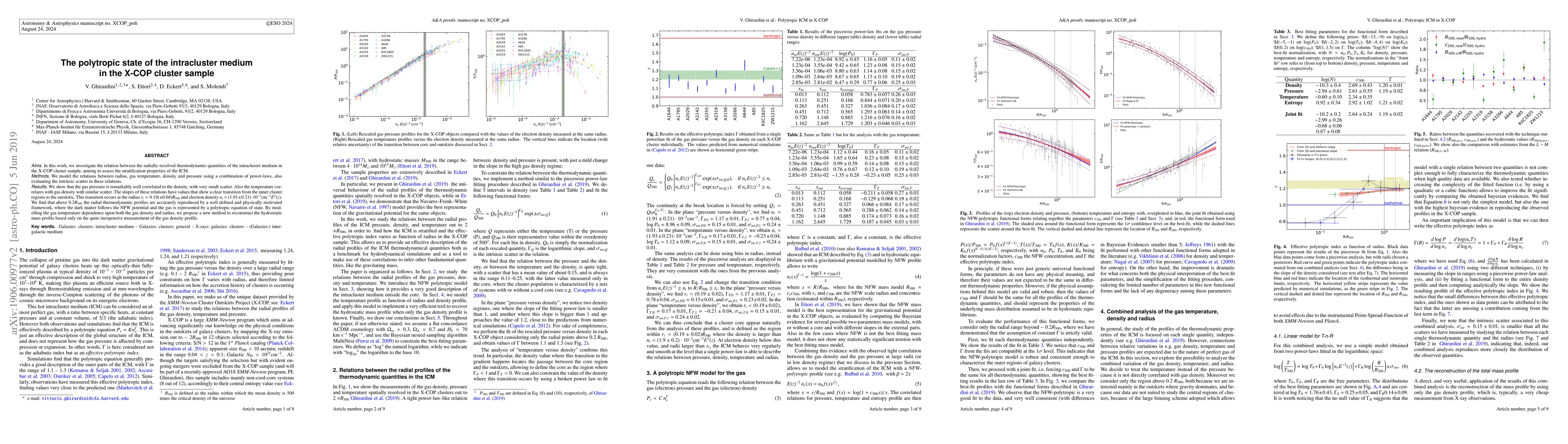 In this work, we investigate the relation between the radially-resolved thermodynamic quantities of the intracluster medium in the X-COP cluster sample, aiming to assess the stratification properties of the ICM. We model the relations between radius, gas temperature, density and pressure using a combination of power-laws, also evaluating the intrinsic scatter in these relations. We show that the gas pressure is remarkably well correlated to the density, with very small scatter. Also, the temperature correlates with gas density with similar scatter. The slopes of these relations have values that show a clear transition from the inner cluster regions to the outskirts. This transition occurs at the radius $r_t = 0.19(\pm0.04)R_{500}$ and electron density $n_t = (1.91\pm0.21)\cdot10^{-3} cm^{-3} E^2 (z)$. We find that above 0.2 $R_{500}$ the radial thermodynamic profiles are accurately reproduced by a well defined and physically motivated framework, where the dark matter follows the NFW potential and the gas is represented by a polytropic equation of state. By modeling the gas temperature dependence upon both the gas density and radius, we propose a new method to reconstruct the hydrostatic mass profile based only on the quite inexpensive measurement of the gas density profile.