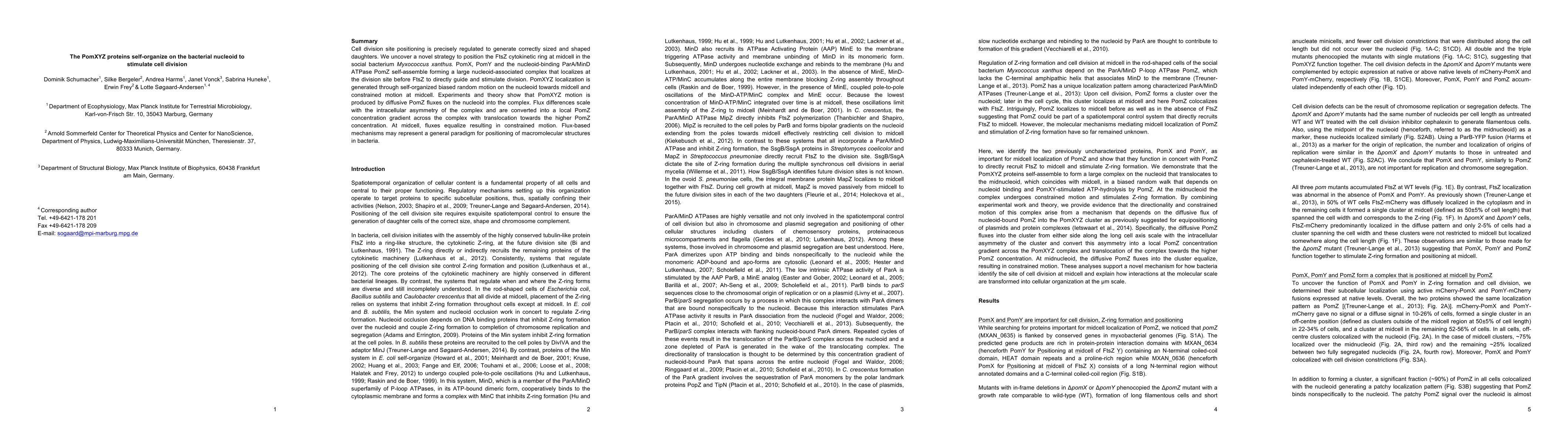 This paper reveals that PomXYZ proteins self-organize on the bacterial nucleoid to position the FtsZ ring at midcell in Myxococcus xanthus, utilizing diffusive PomZ fluxes and concentration gradients to guide cell division. This self-organized mechanism may serve as a general strategy for macromolecular structure positioning in bacteria.