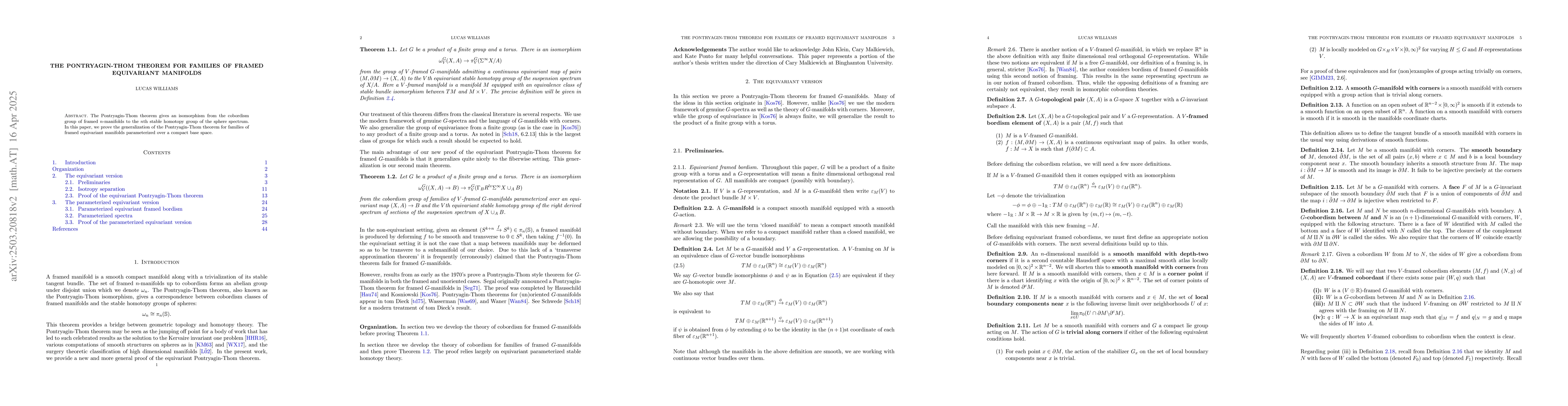 The paper extends the Pontryagin-Thom theorem to families of framed equivariant manifolds parameterized over a compact base space, utilizing advanced techniques in algebraic topology and differential geometry.