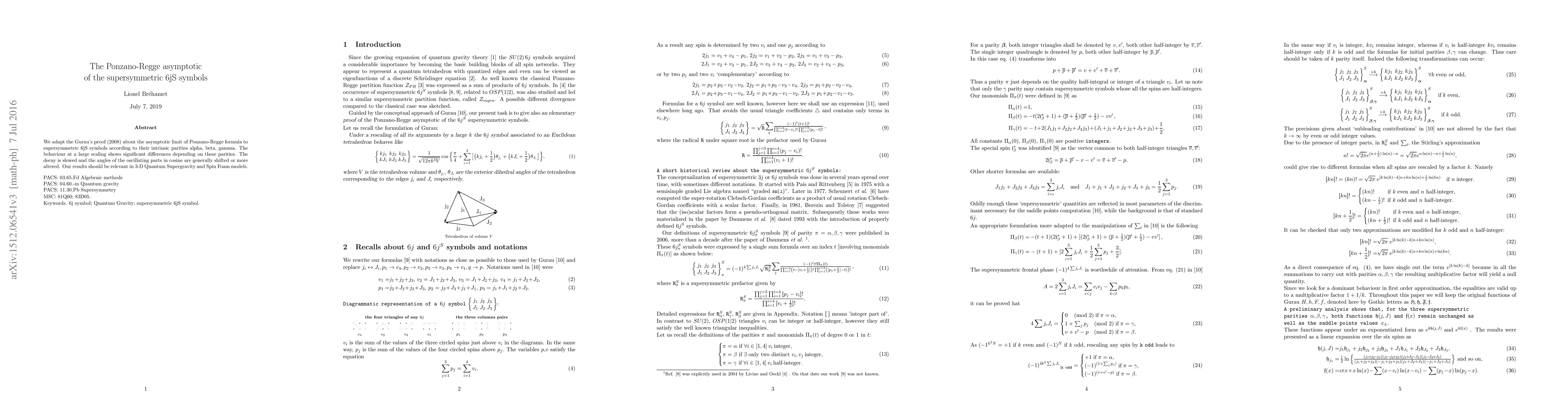 We adapt the Gurau's proof (2008) about the asymptotic limit of Ponzano-Regge formula to supersymmetric 6jS symbols according to their intrinsic parities alpha, beta, gamma. The behaviour at a large scaling shows significant differences depending on these parities. The decay is slowed and the angles of the oscillating parts in cosine are generally shifted or more altered.Our results should be relevant in 3-D Quantum Supergravity and Spin Foam models. PACS: 03.65.Fd Algebraic methods PACS: 04.60.-m Quantum gravity PACS: 11.30.Pb Supersymmetry MSC: 81Q60; 83D05.