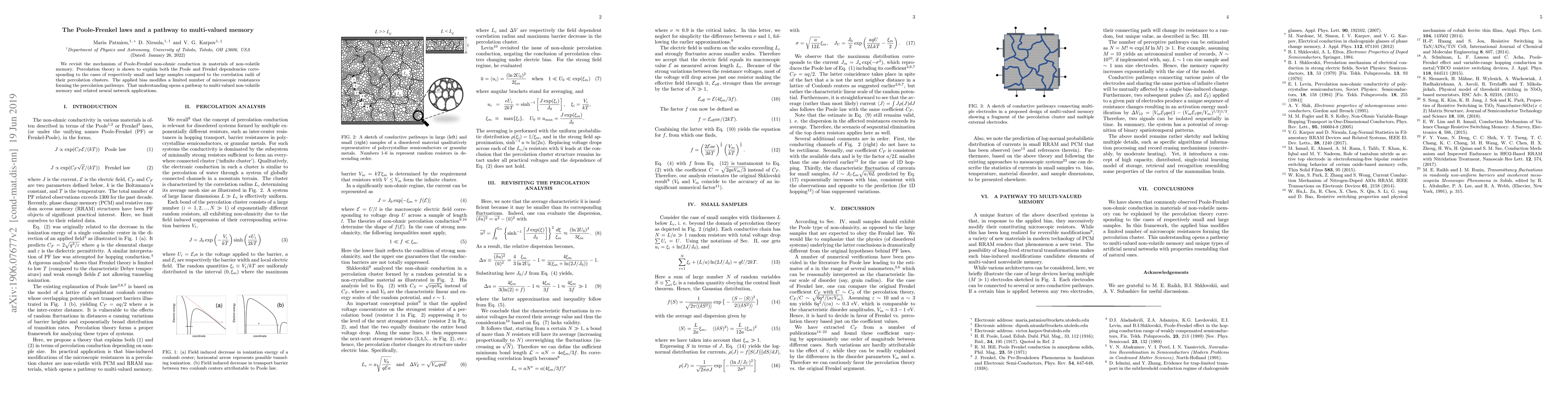 We revisit the mechanism of Poole-Frenkel non-ohmic conduction in materials of non-volatile memory. Percolation theory is shown to explain both the Poole and Frenkel dependencies corresponding to the cases of respectively small and large samples compared to the correlation radii of their percolation clusters. The applied bias modifies a limited number of microscopic resistances forming the percolation pathways. That understanding opens a pathway to multi-valued non-volatile memory and related neural network applications.