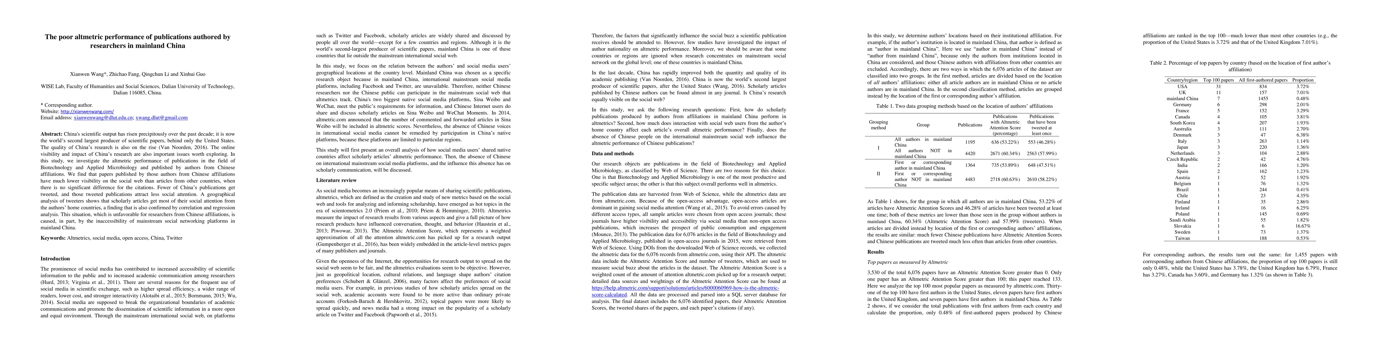 China's scientific output has risen precipitously over the past decade; it is now the world's second-largest producer of scientific papers, behind only the United States. The quality of China's research is also on the rise (Van Noorden, 2016). The online visibility and impact of China's research are also important issues worth exploring. In this study, we investigate the altmetric performance of publications in the field of Biotechnology and Applied Microbiology and published by authors from Chinese affiliations. We find that papers published by those authors from Chinese affiliations have much lower visibility on the social web than articles from other countries, when there is no significant difference for the citations. Fewer of China's publications get tweeted, and those tweeted publications attract less social attention. A geographical analysis of tweeters shows that scholarly articles get most of their social attention from the authors' home countries, a finding that is also confirmed by correlation and regression analysis. This situation, which is unfavorable for researchers from Chinese affiliations, is caused, in part, by the inaccessibility of mainstream social networking platforms in mainland China.