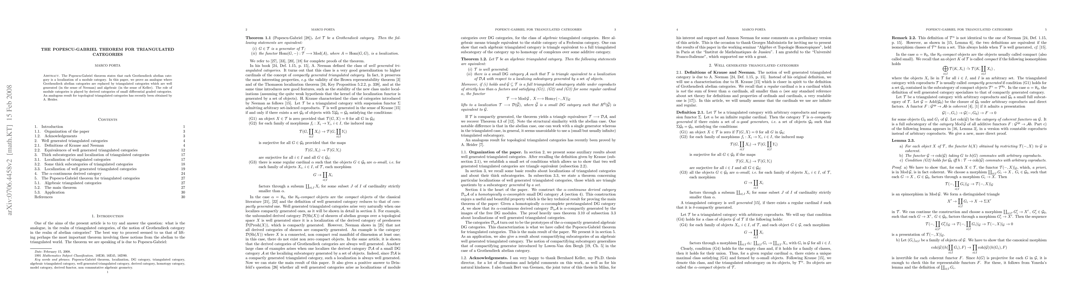 The Popescu-Gabriel theorem is extended to triangulated categories, showing that well-generated and algebraic triangulated categories can be localized from derived categories of small differential graded categories. This analogue parallels recent results for topological triangulated categories.