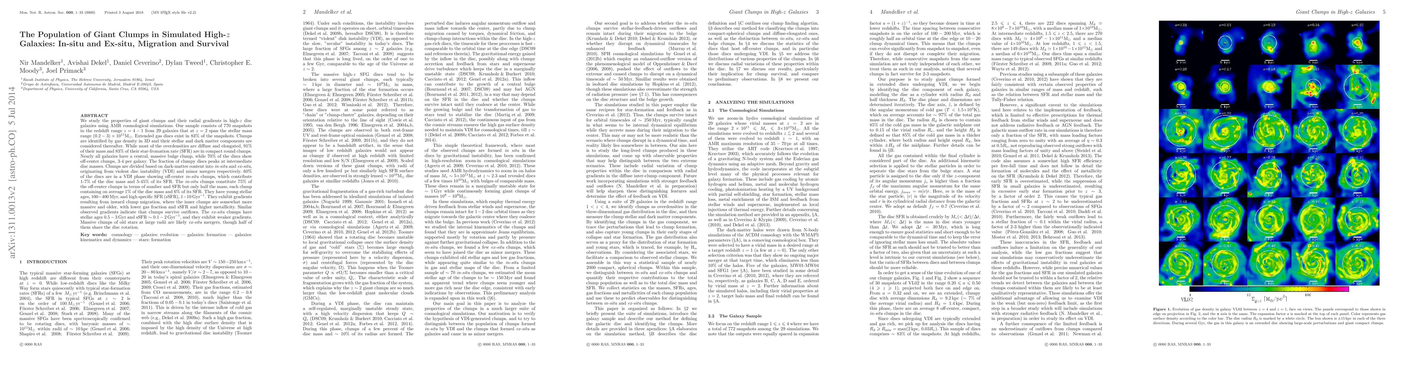 We study the properties of giant clumps and their radial gradients in high-$z$ disc galaxies using AMR cosmological simulations. Our sample consists of 770 snapshots in the redshift range $z=4-1$ from 29 galaxies that at $z=2$ span the stellar mass range $(0.2-3)\times 10^{11}M_{\odot}$. Extended gas discs exist in 83% of the snapshots. Clumps are identified by gas density in 3D and their stellar and dark matter components are considered thereafter. While most of the overdensities are diffuse and elongated, 91% of their mass and 83% of their star-fromation rate (SFR) are in compact round clumps. Nearly all galaxies have a central, massive bulge clump, while 70% of the discs show off-center clumps, 3-4 per galaxy. The fraction of clumpy discs peaks at intermediate disc masses. Clumps are divided based on dark-matter content into $\textit{in-situ}$ and $\textit{ex-situ}$, originating from violent disc instability (VDI) and minor mergers respectively. 60% of the discs are in a VDI phase showing off-center $\textit{in-situ}$ clumps, which contribute 1-7% of the disc mass and 5-45% of its SFR. The $\textit{in-situ}$ clumps constitute 75% of the off-center clumps in terms of number and SFR but only half the mass, each clump containing on average 1% of the disc mass and 6% of its SFR. They have young stellar ages, $100-400 {\rm Myr}$, and high specific SFR (sSFR), $1-10 {\rm Gyr}^{-1}$. They exhibit gradients resulting from inward clump migration, where the inner clumps are somewhat more massive and older, with lower gas fraction and sSFR and higher metallicity. Similar observed gradients indicate that clumps survive outflows. The \exsitu clumps have stellar ages $0.5-3 {\rm Gyr}$ and sSFR $\sim 0.1-2 {\rm Gyr}^{-1}$, and they exhibit weaker gradients. Massive clumps of old stars at large radii are likely \exsitu mergers, though half of them share the disc rotation.