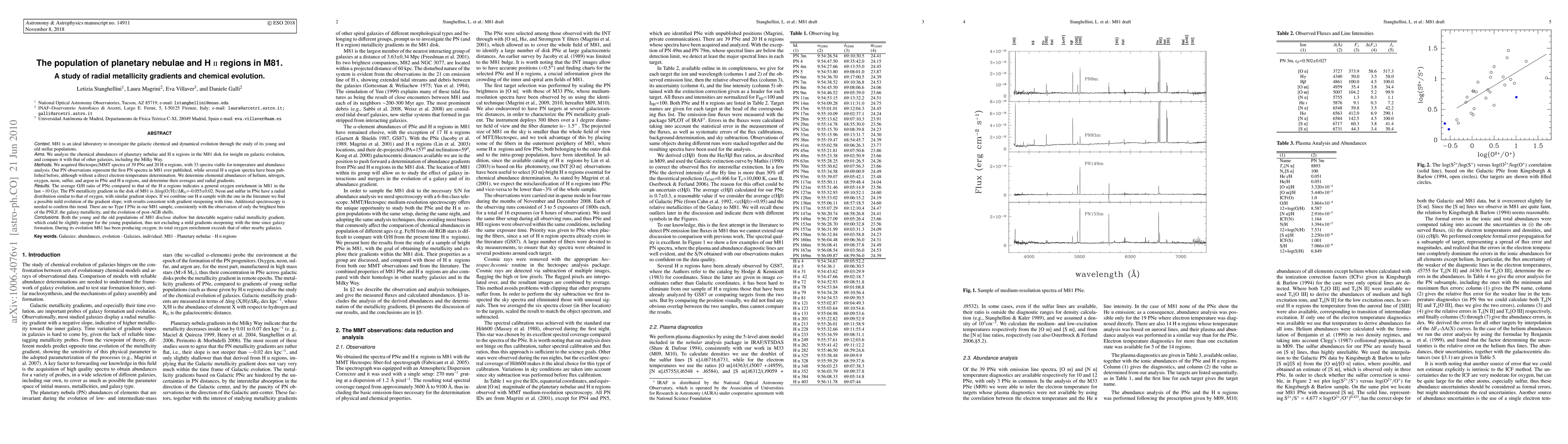 This study analyzes the chemical abundances of planetary nebulae (PNe) and HII regions in M81 to understand galactic evolution, revealing a general oxygen enrichment over the last ~10 Gyr. The PN metallicity gradient in M81's disk is -0.055±0.02 dex/kpc, with neon and sulfur showing similar radial distributions and gradients.