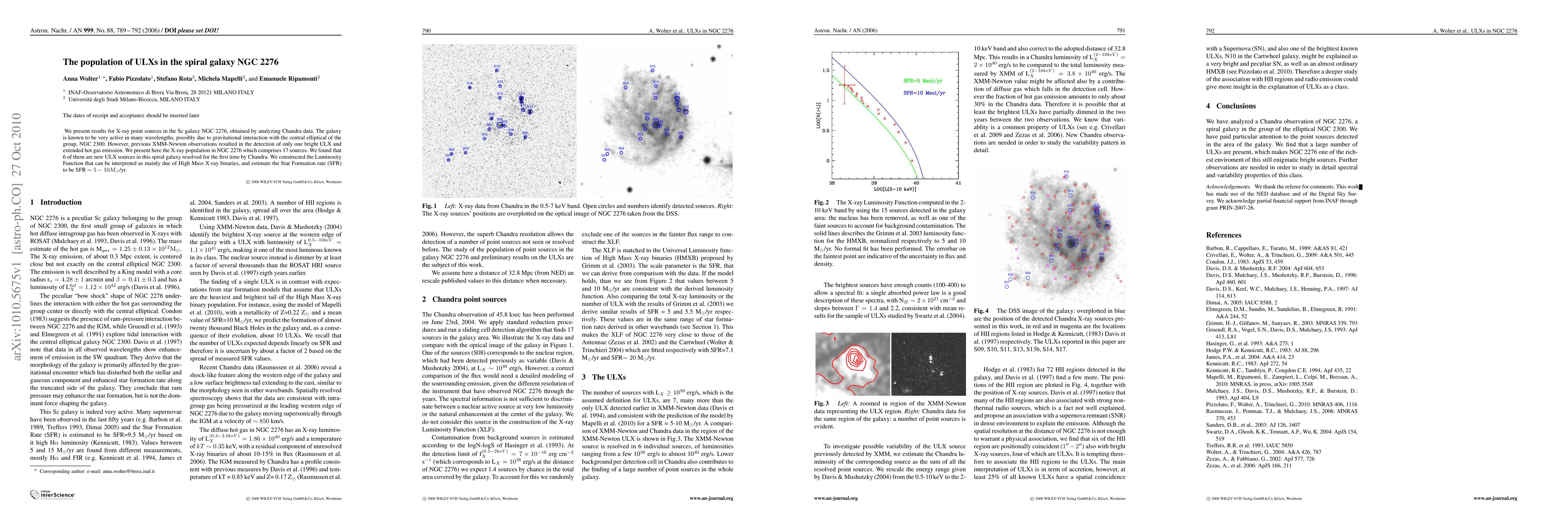 We present results for X-ray point sources in the Sc galaxy NGC 2276, obtained by analyzing Chandra data. The galaxy is known to be very active in many wavelengths, possibly due to gravitational interaction with the central elliptical of the group, NGC 2300. However, previous XMM-Newton observations resulted in the detection of only one bright ULX and extended hot gas emission. We present here the X-ray population in NGC 2276 which comprises 17 sources. We found that 6 of them are new ULX sources in this spiral galaxy resolved for the first time by Chandra. We constructed the Luminosity Function that can be interpreted as mainly due of High Mass X-ray binaries, and estimate the Star Formation rate (SFR) to be SFR ~ 5-10 M_sun/yr.