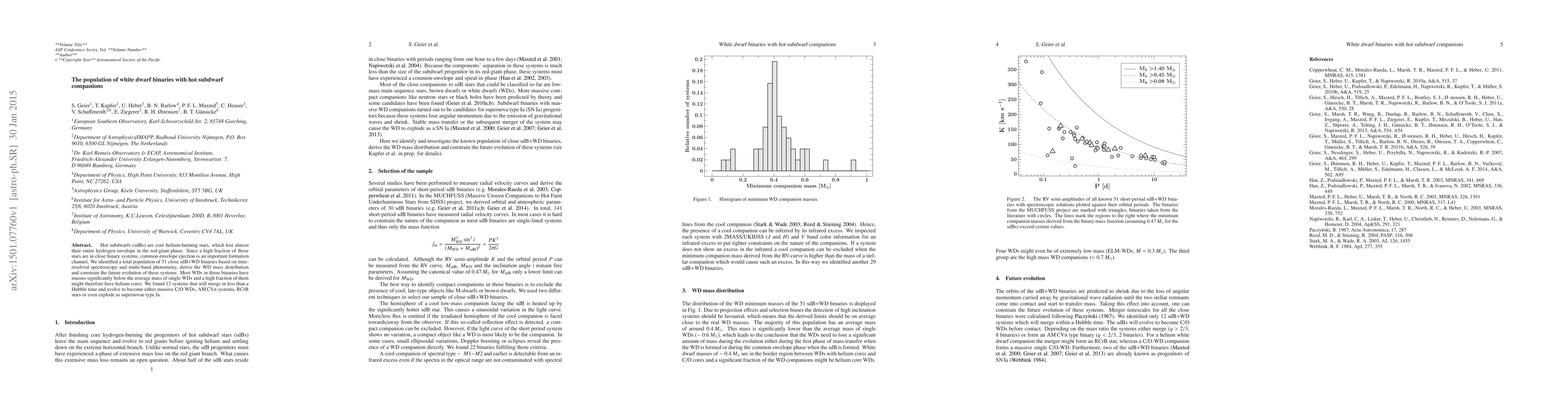 Hot subdwarfs (sdBs) are core helium-burning stars, which lost almost their entire hydrogen envelope in the red-giant phase. Since a high fraction of those stars are in close binary systems, common envelope ejection is an important formation channel. We identified a total population of 51 close sdB+WD binaries based on time-resolved spectroscopy and multi-band photometry, derive the WD mass distribution and constrain the future evolution of these systems. Most WDs in those binaries have masses significantly below the average mass of single WDs and a high fraction of them might therefore have helium cores. We found 12 systems that will merge in less than a Hubble time and evolve to become either massive C/O WDs, AM\,CVn systems, RCrB stars or even explode as supernovae type Ia.