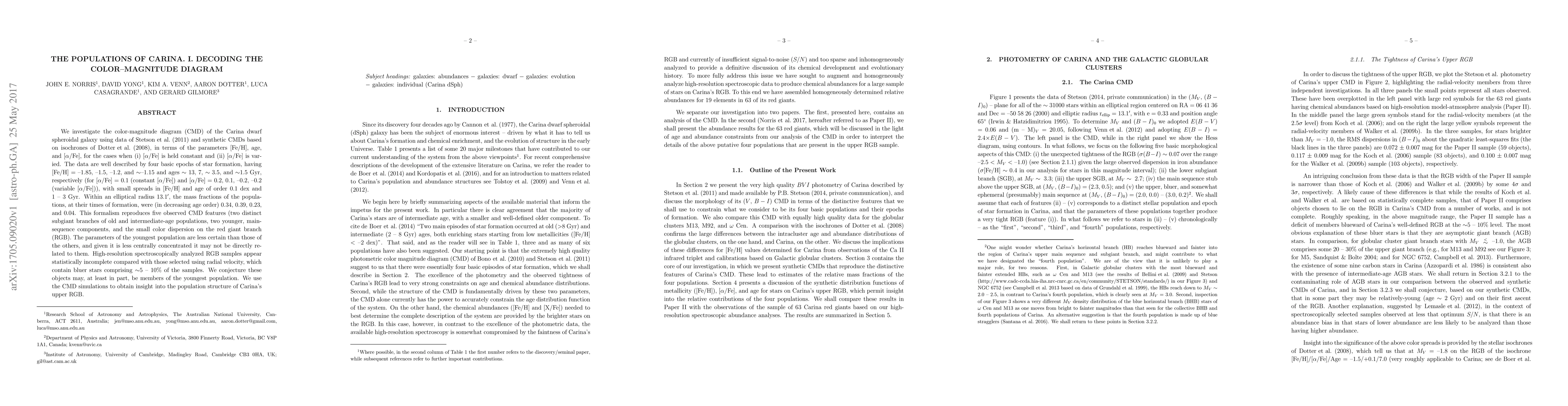 This study decodes the Carina dwarf spheroidal galaxy's color-magnitude diagram (CMD) revealing four star formation epochs with distinct [Fe/H] and age parameters. The CMD features are well reproduced by varying [alpha/Fe] ratios, suggesting the presence of five distinct stellar populations.