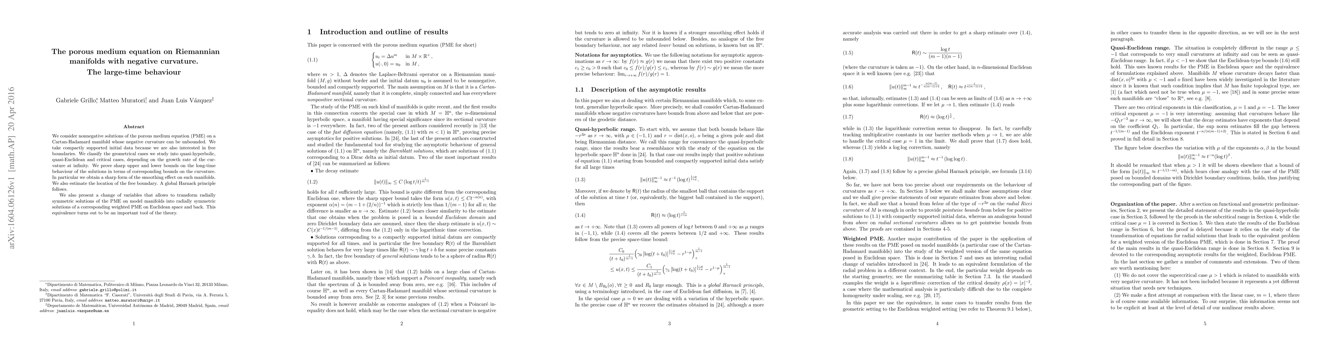 This paper studies nonnegative solutions of the porous medium equation on negatively curved Cartan-Hadamard manifolds, classifying cases based on curvature growth rates and proving sharp upper and lower bounds on long-time behavior. It also introduces a change of variables to transform solutions between model manifolds and Euclidean space, facilitating analysis.